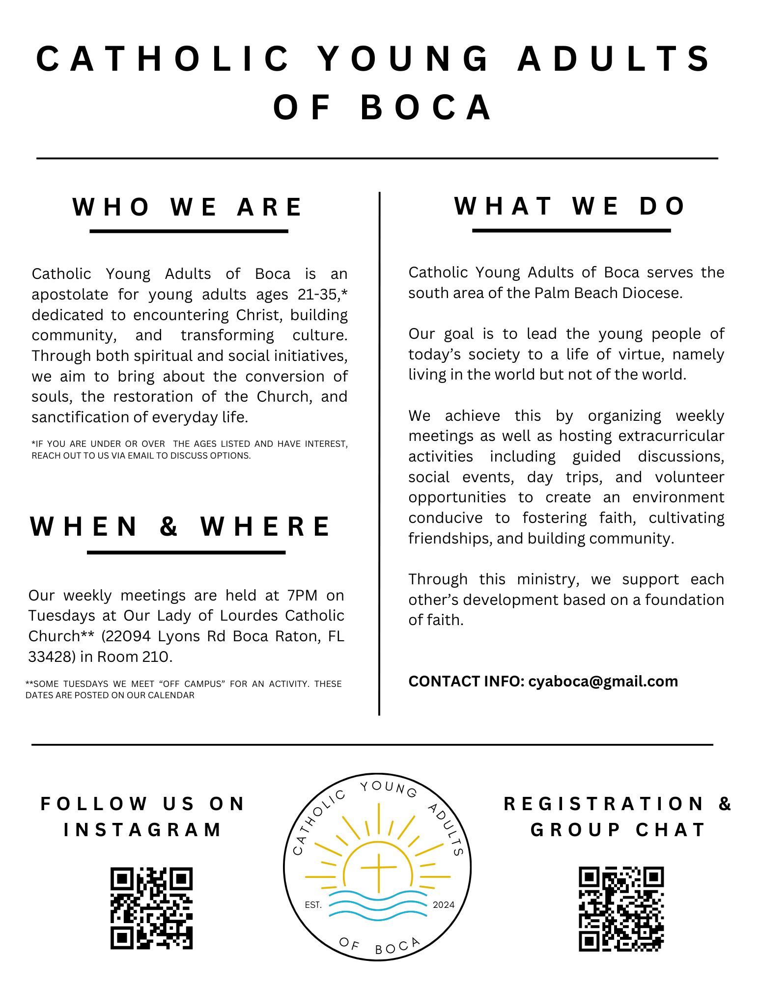 Young adult ministry covers over 20 years (19-39) and 5 major stages of life, below is a list of active young adult ministry in local parishes throughout the Diocese of Palm Beach. Because young adult ministry is varied and vast it can be “pop up” or off campus and not be as public as campus-based ministry. As you begin your ministry search, we encourage you to begin by reaching out to and connecting with your local parish first for young adult happenings in your area.