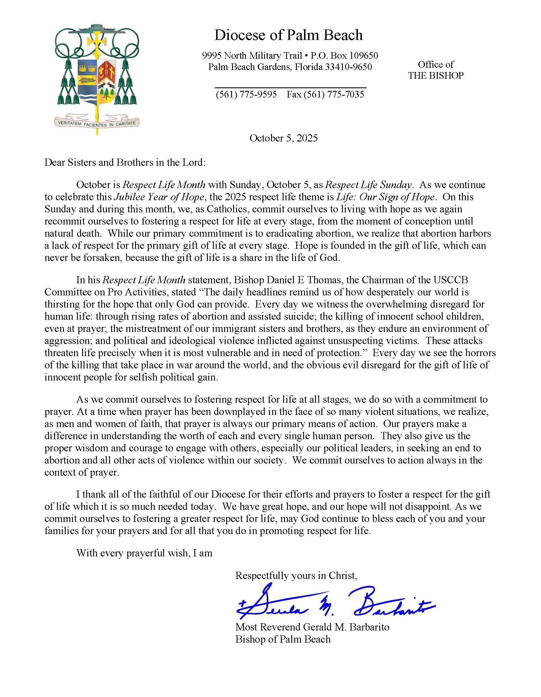 Bishop Barbarito's Letter for Respect Life Sunday for Oct 4th and 5th