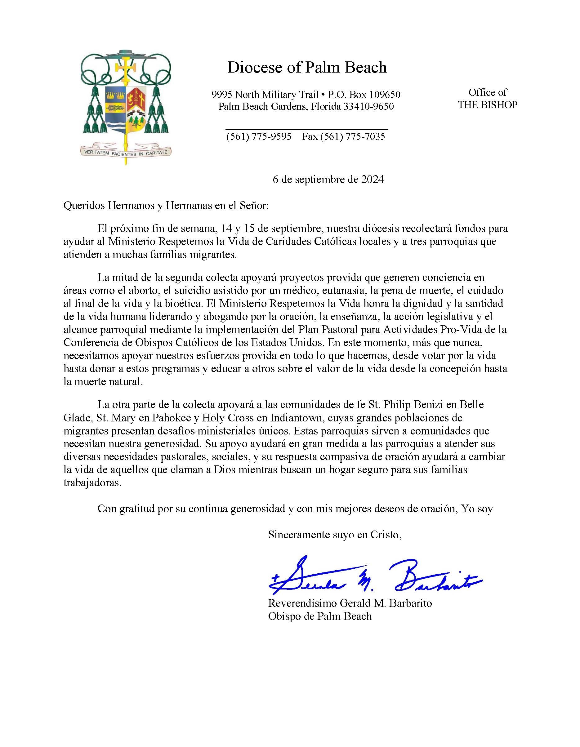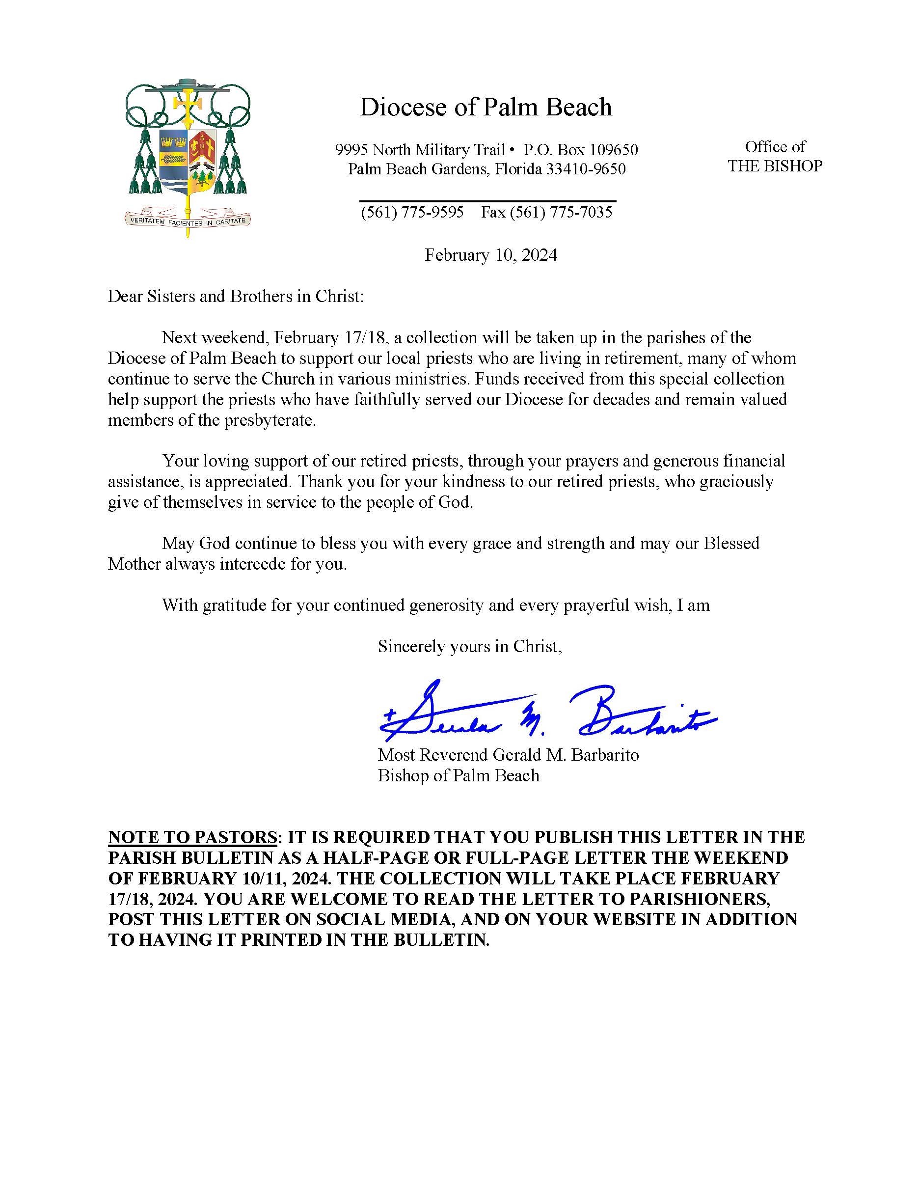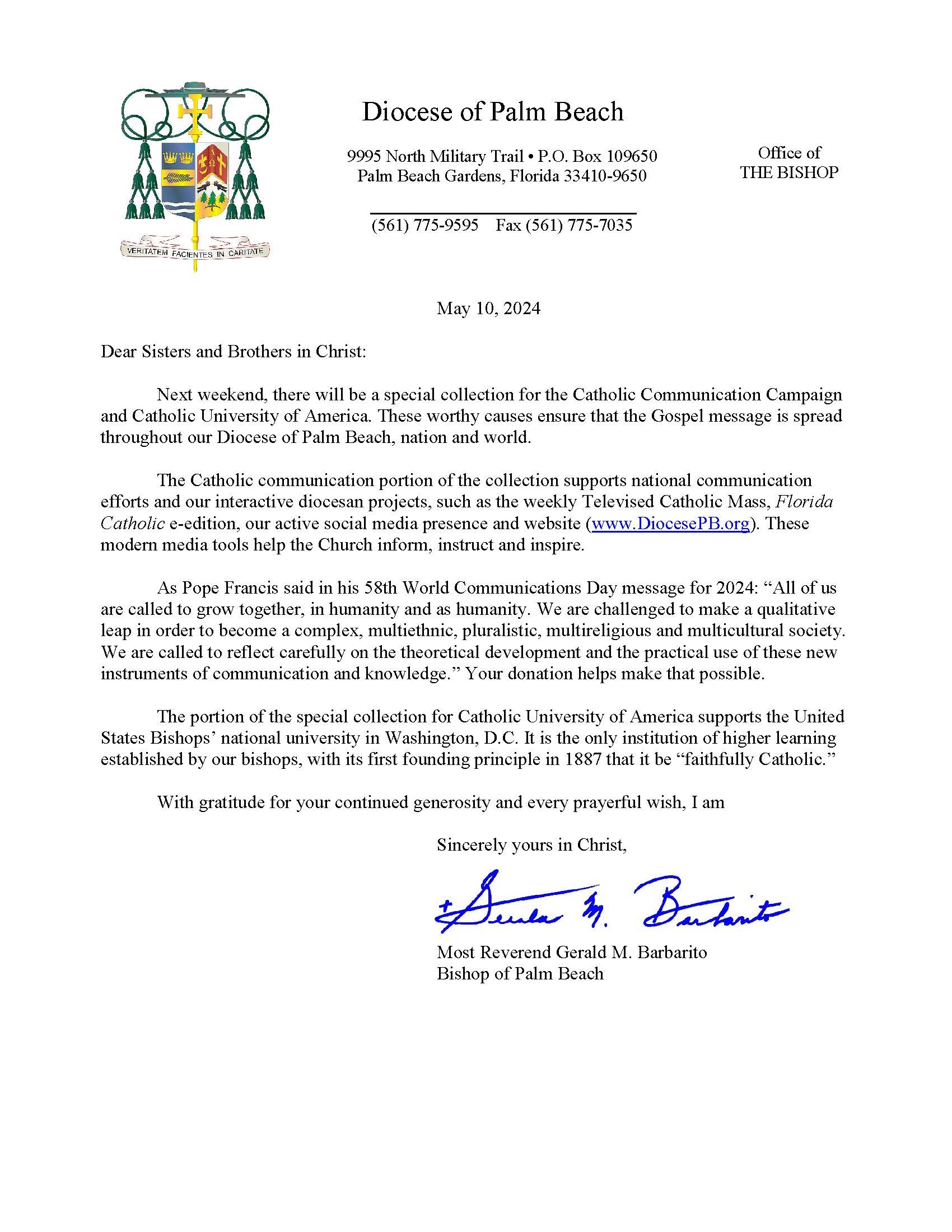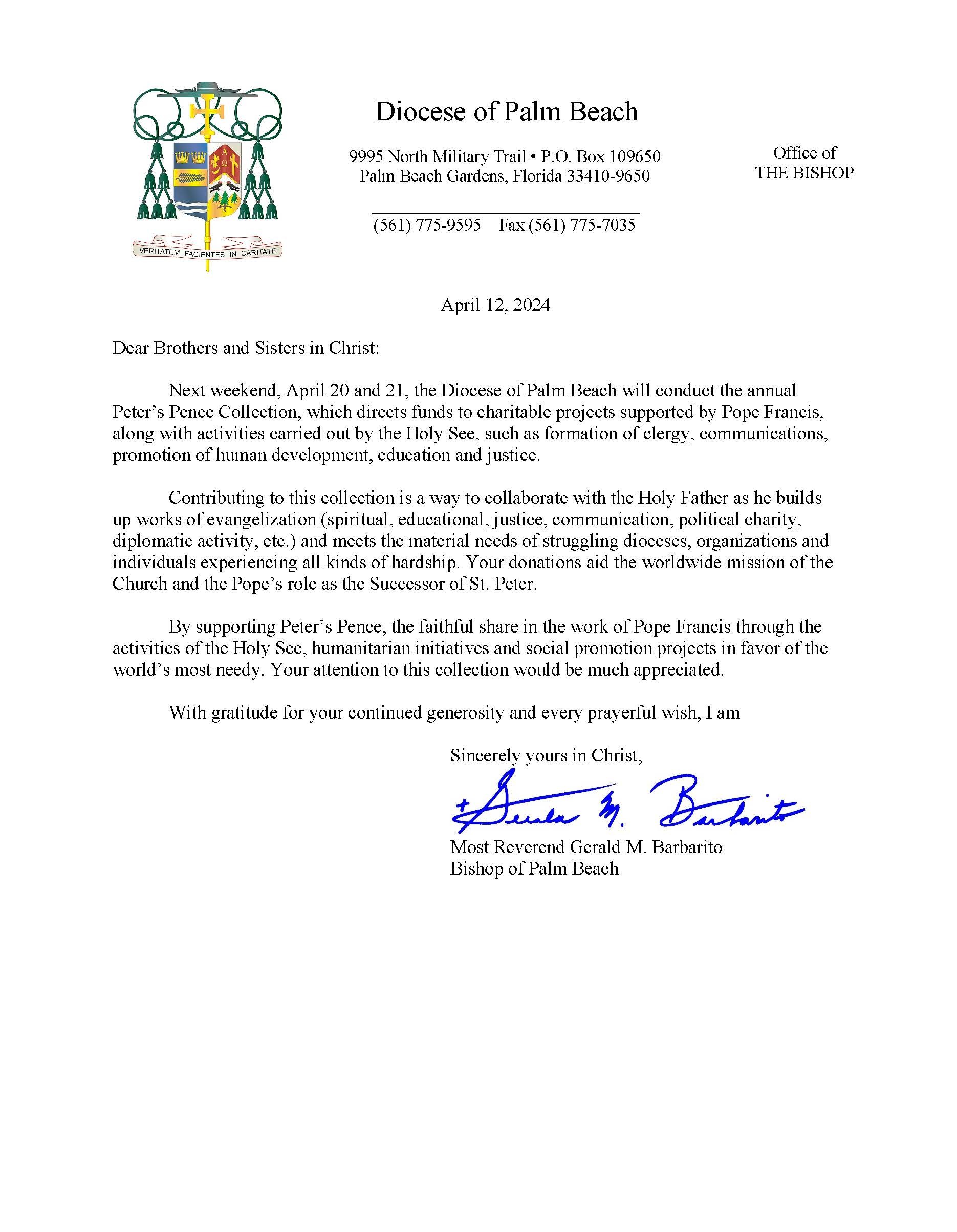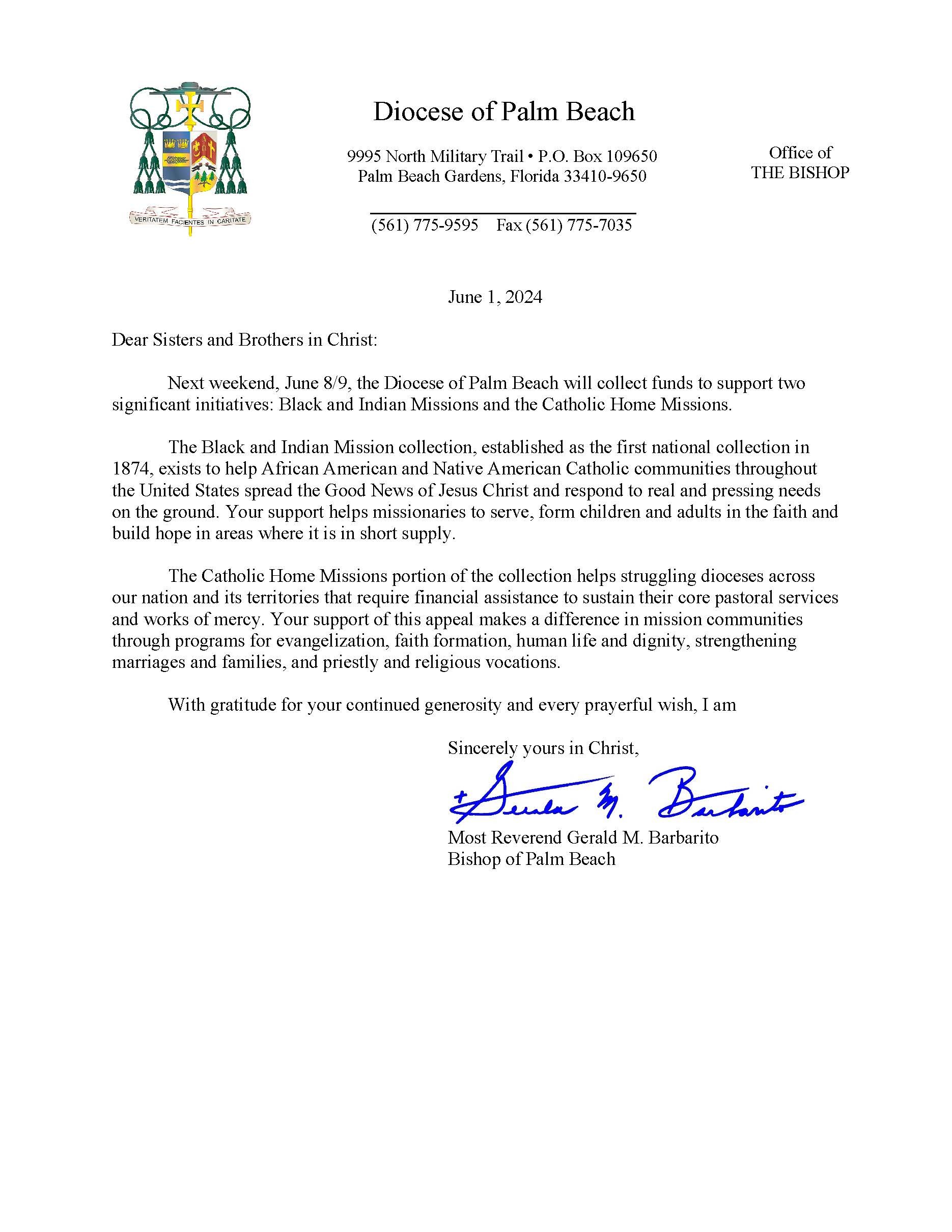 Below are the letters required to be published as a full page or half page in parish bulletins the weekend before the collection occurs. These letters are from the Bishop and the branding standards of the letter should be followed. The letter may also be read aloud, in addition to it being printed in the bulletin and shared on your parish’s social media and/or website. If you have questions about the letters, please contact the diocesan Director of Communications and Development (Jennifer Trefelner). If you have questions about reporting and submitting collection funds, please contact the diocesan Finance Office.