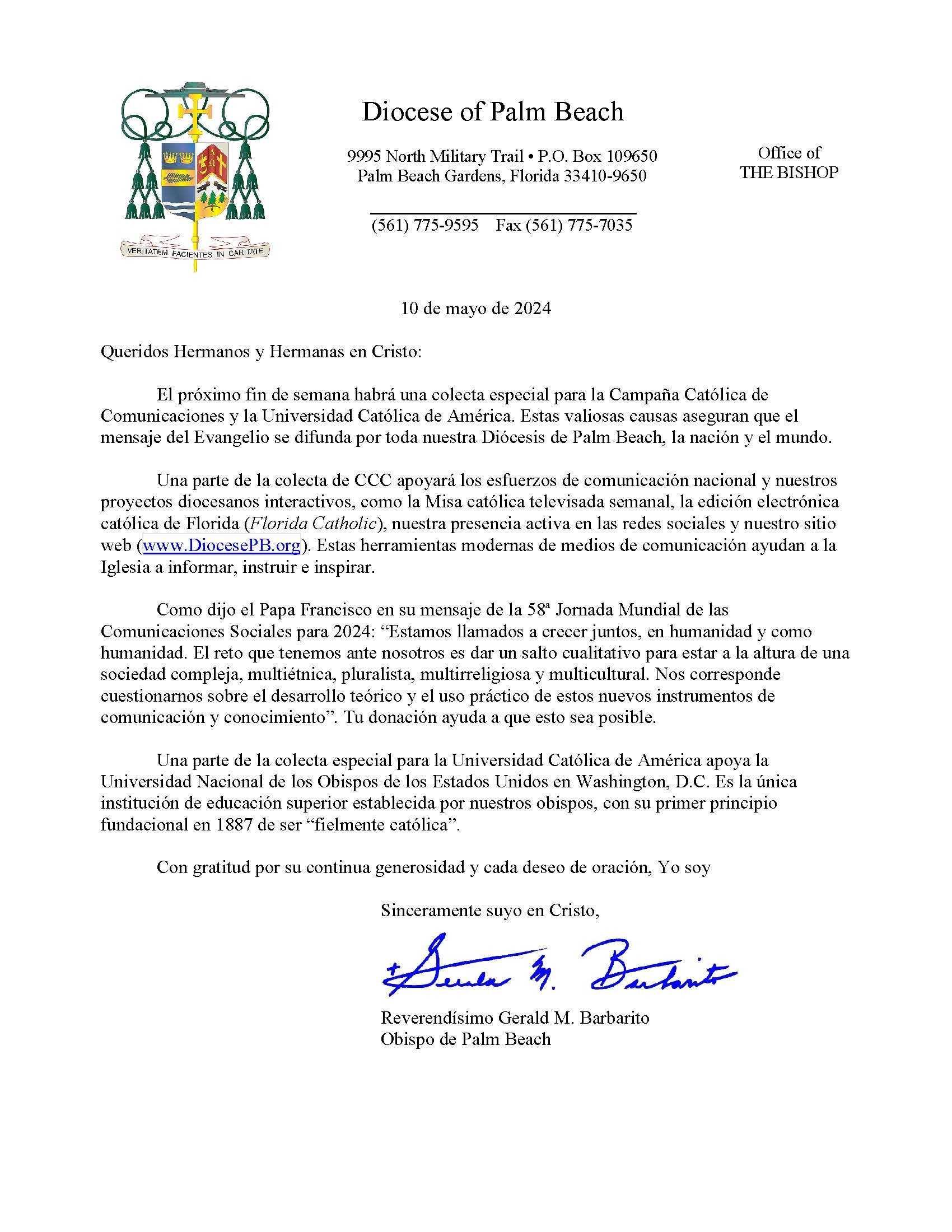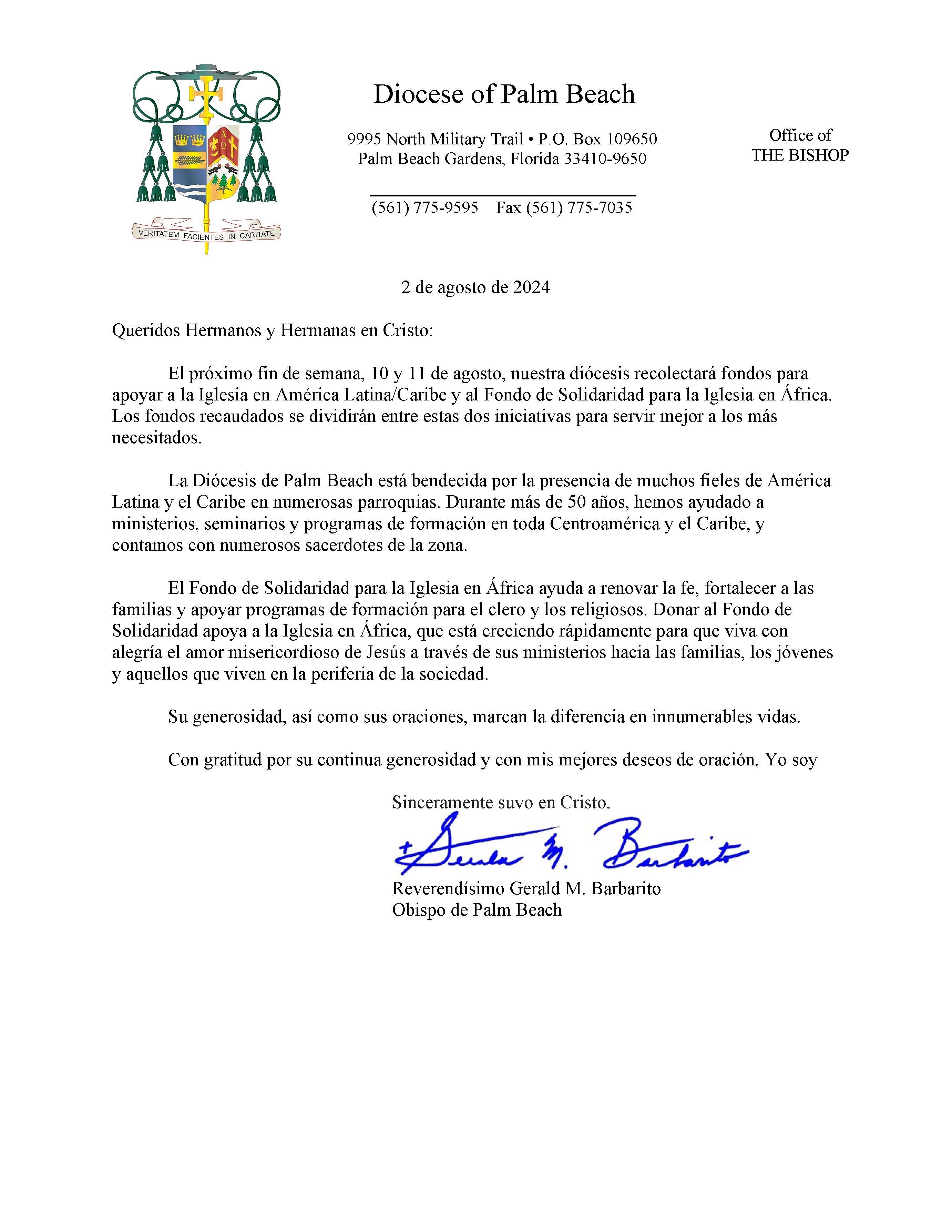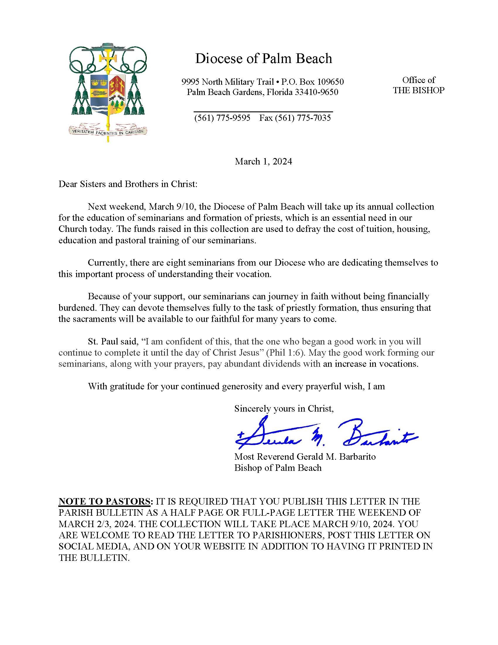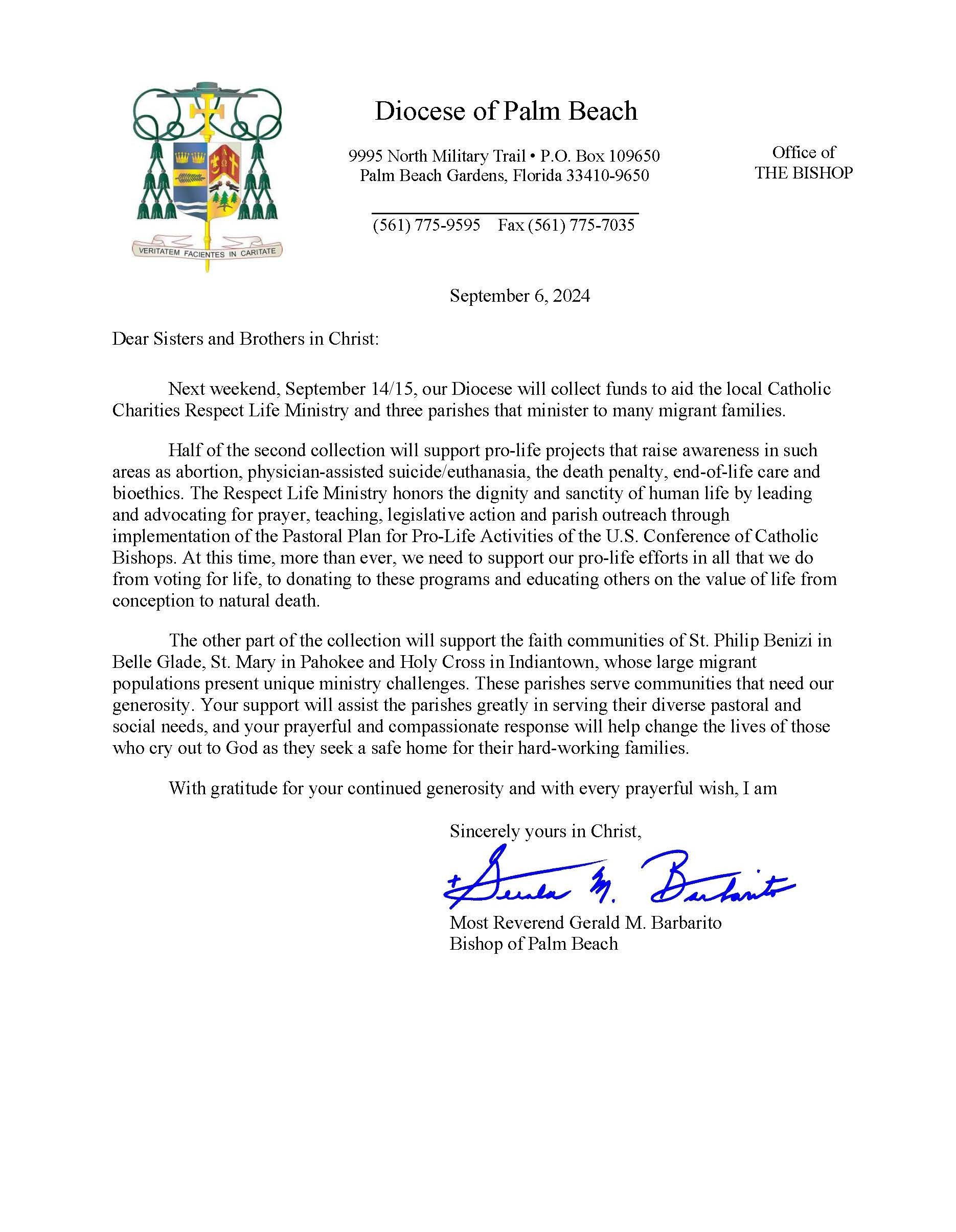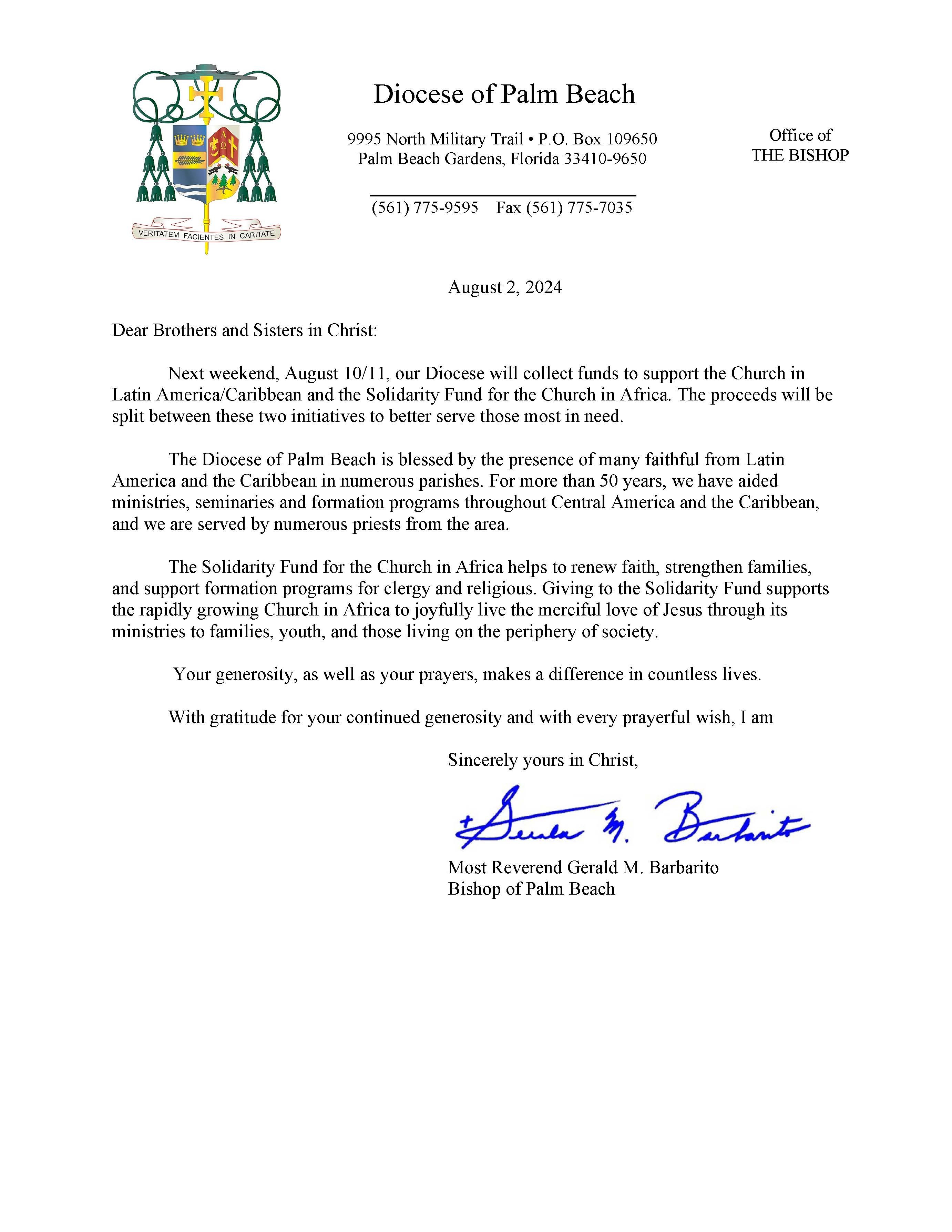 Below are the letters required to be published as a full page or half page in parish bulletins the weekend before the collection occurs. These letters are from the Bishop and the branding standards of the letter should be followed. The letter may also be read aloud, in addition to it being printed in the bulletin and shared on your parish’s social media and/or website. If you have questions about the letters, please contact the diocesan Director of Communications and Development (Jennifer Trefelner). If you have questions about reporting and submitting collection funds, please contact the diocesan Finance Office.