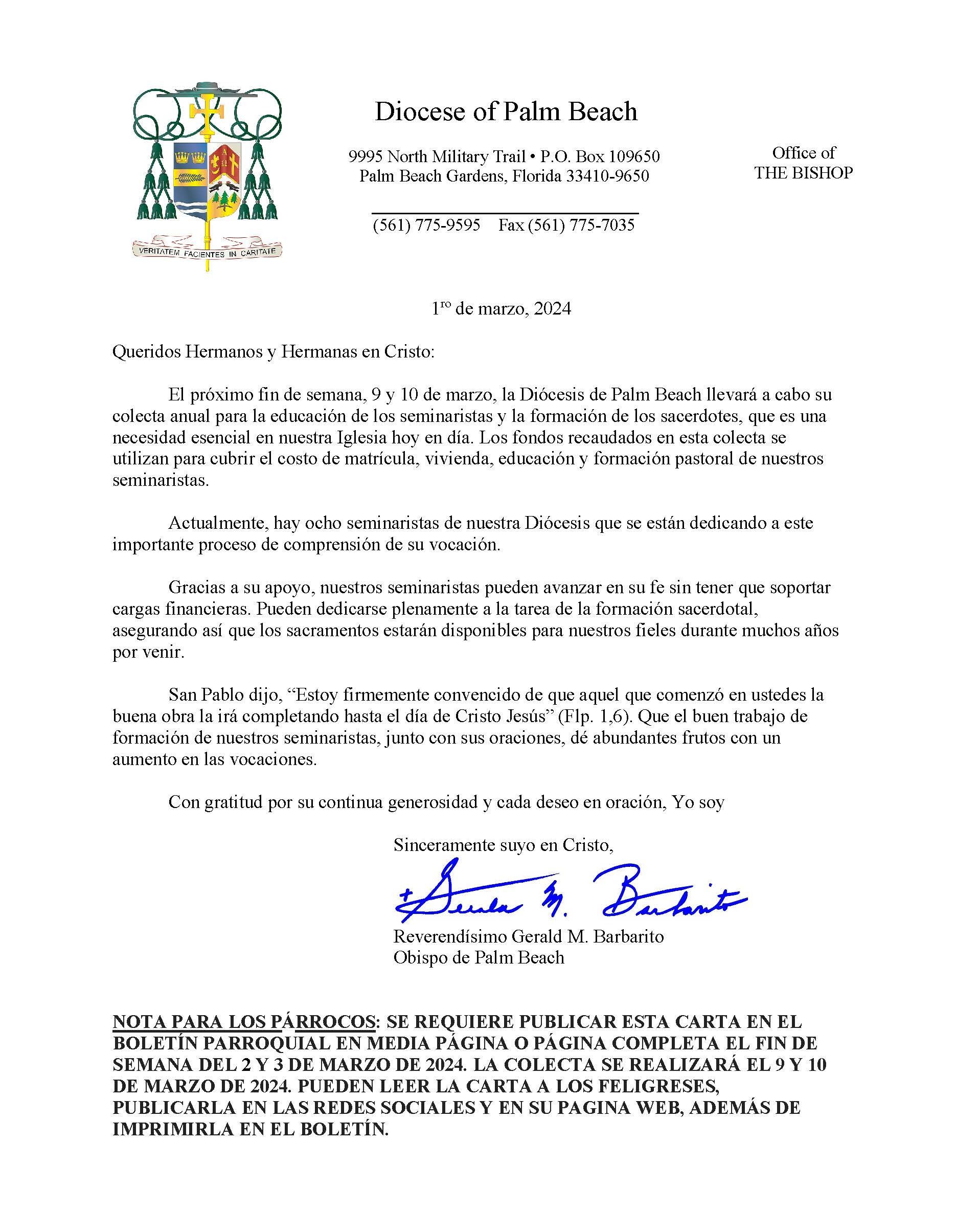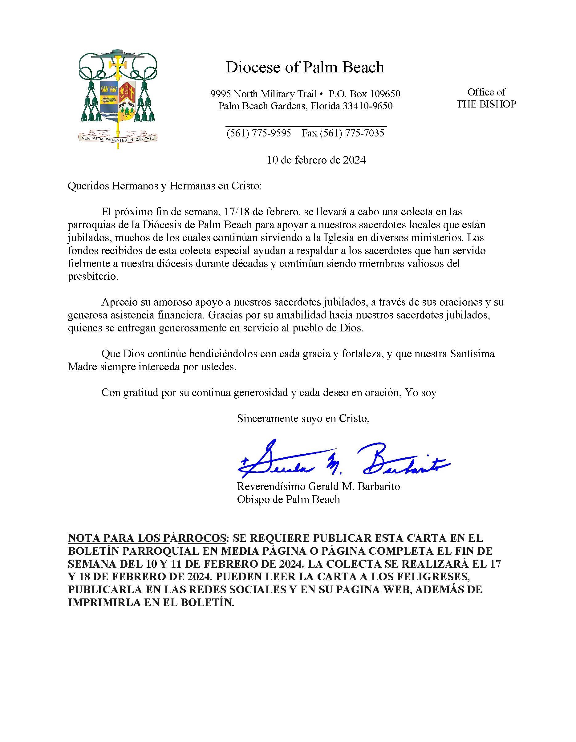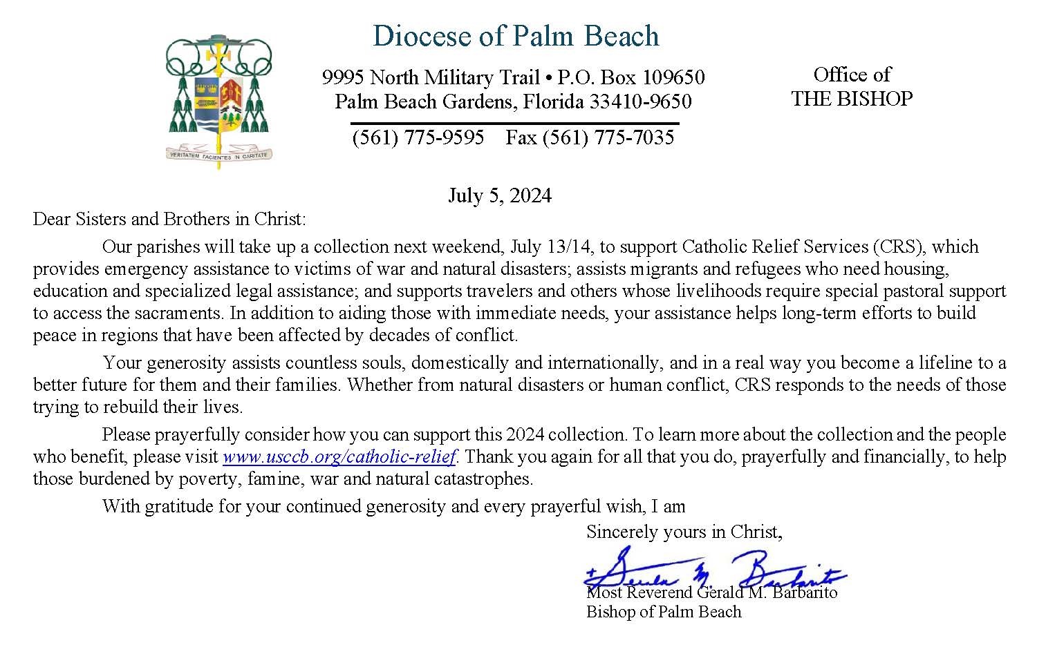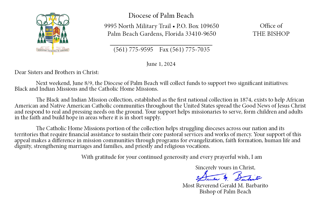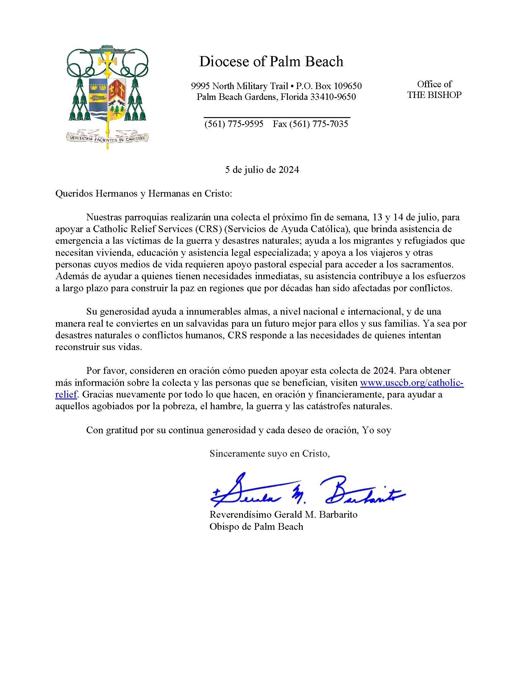 Below are the letters required to be published as a full page or half page in parish bulletins the weekend before the collection occurs. These letters are from the Bishop and the branding standards of the letter should be followed. The letter may also be read aloud, in addition to it being printed in the bulletin and shared on your parish’s social media and/or website. If you have questions about the letters, please contact the diocesan Director of Communications and Development (Jennifer Trefelner). If you have questions about reporting and submitting collection funds, please contact the diocesan Finance Office.