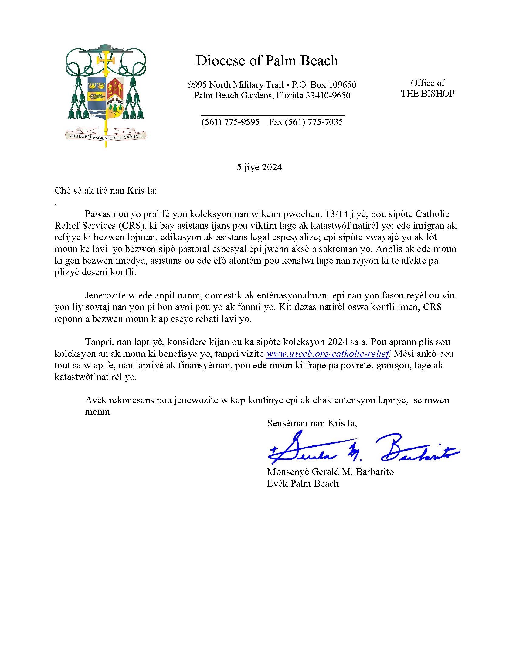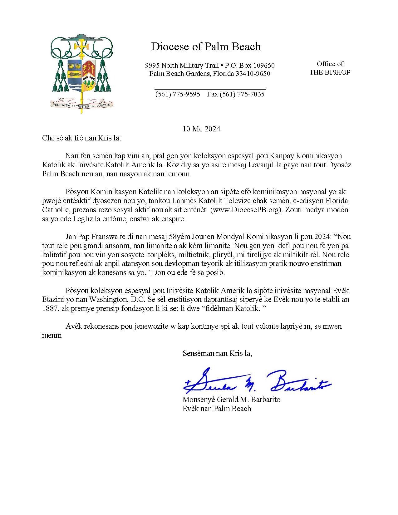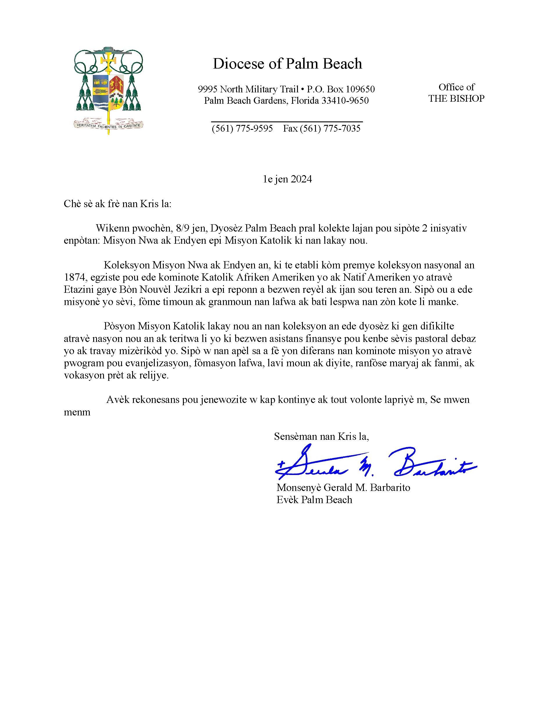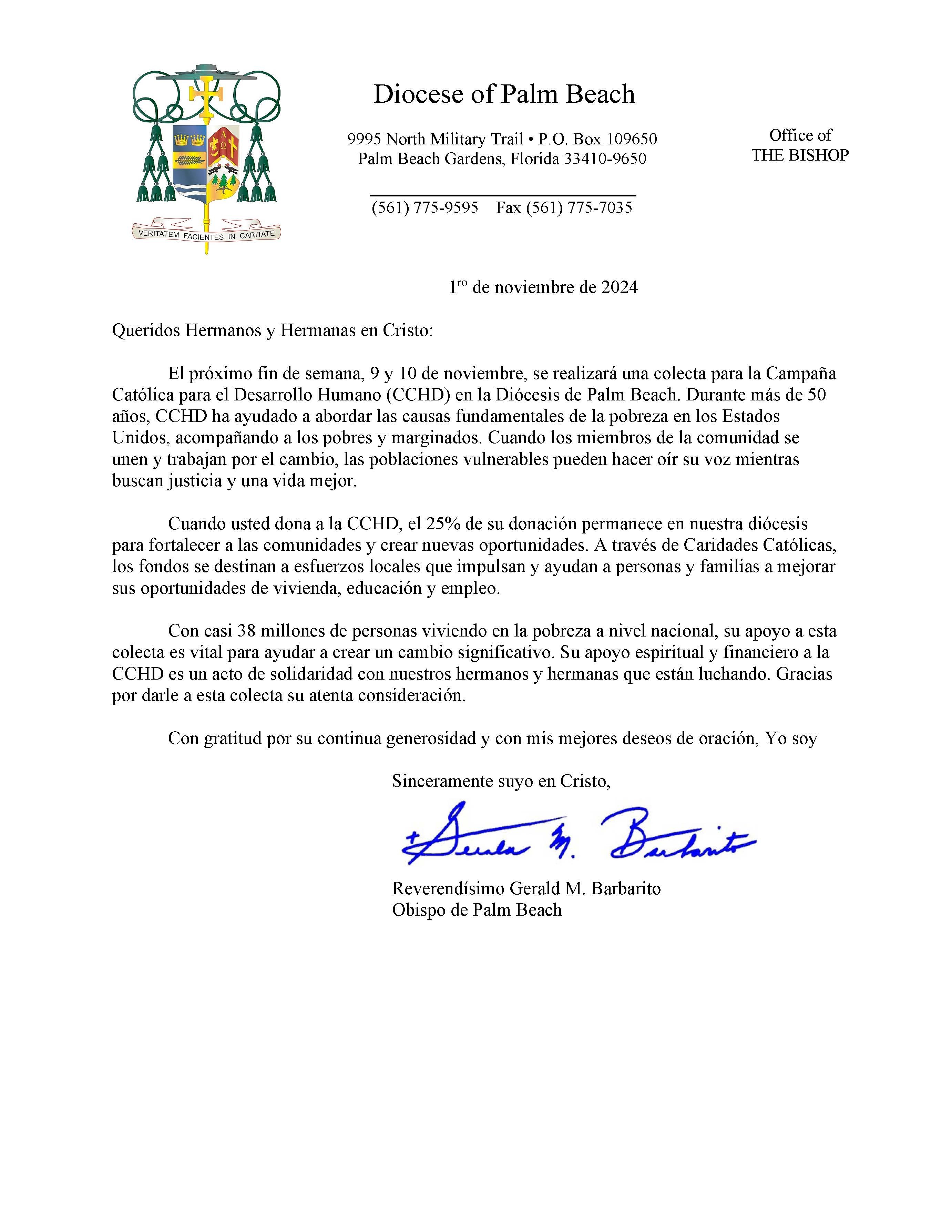 Below are the letters required to be published as a full page or half page in parish bulletins the weekend before the collection occurs. These letters are from the Bishop and the branding standards of the letter should be followed. The letter may also be read aloud, in addition to it being printed in the bulletin and shared on your parish’s social media and/or website. If you have questions about the letters, please contact the diocesan Director of Communications and Development (Jennifer Trefelner). If you have questions about reporting and submitting collection funds, please contact the diocesan Finance Office.