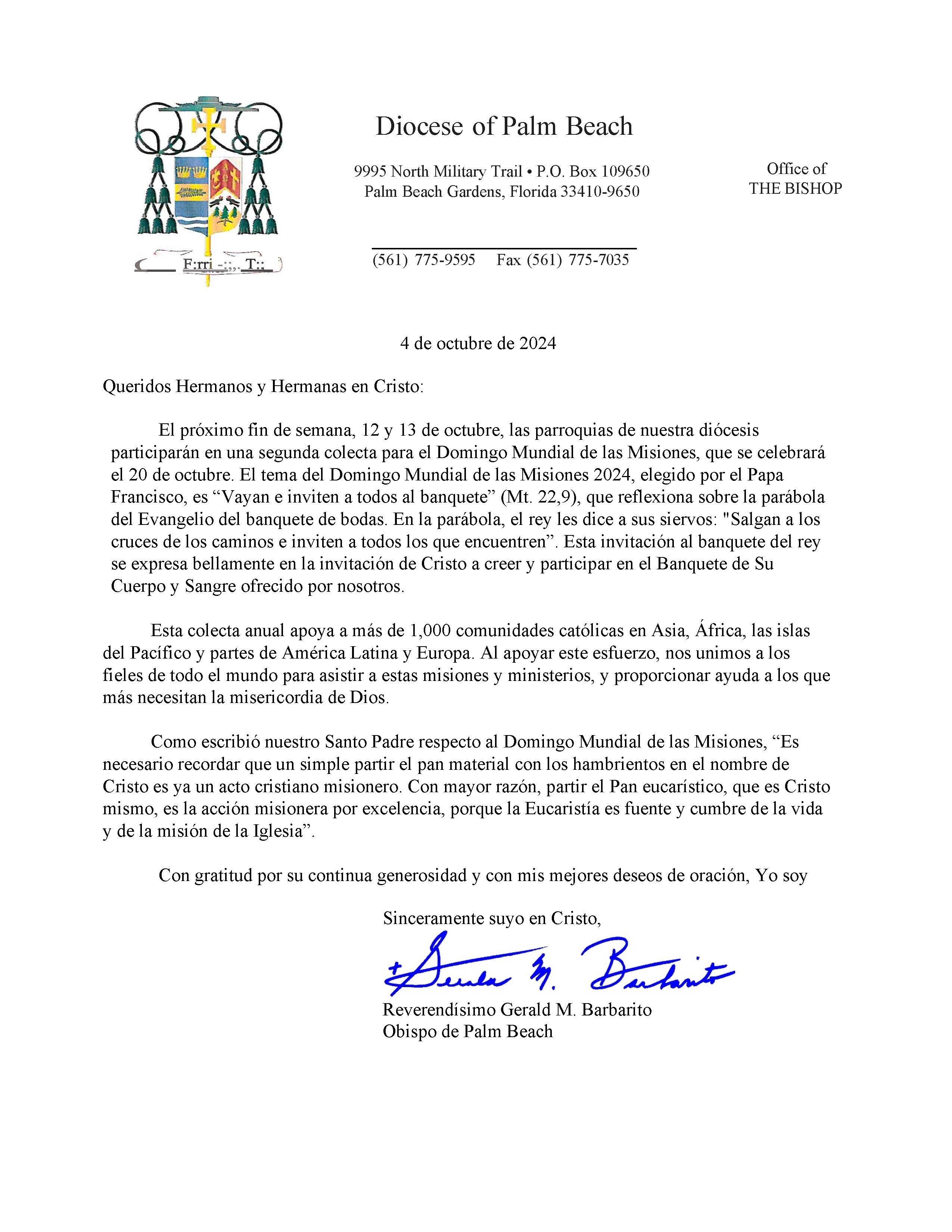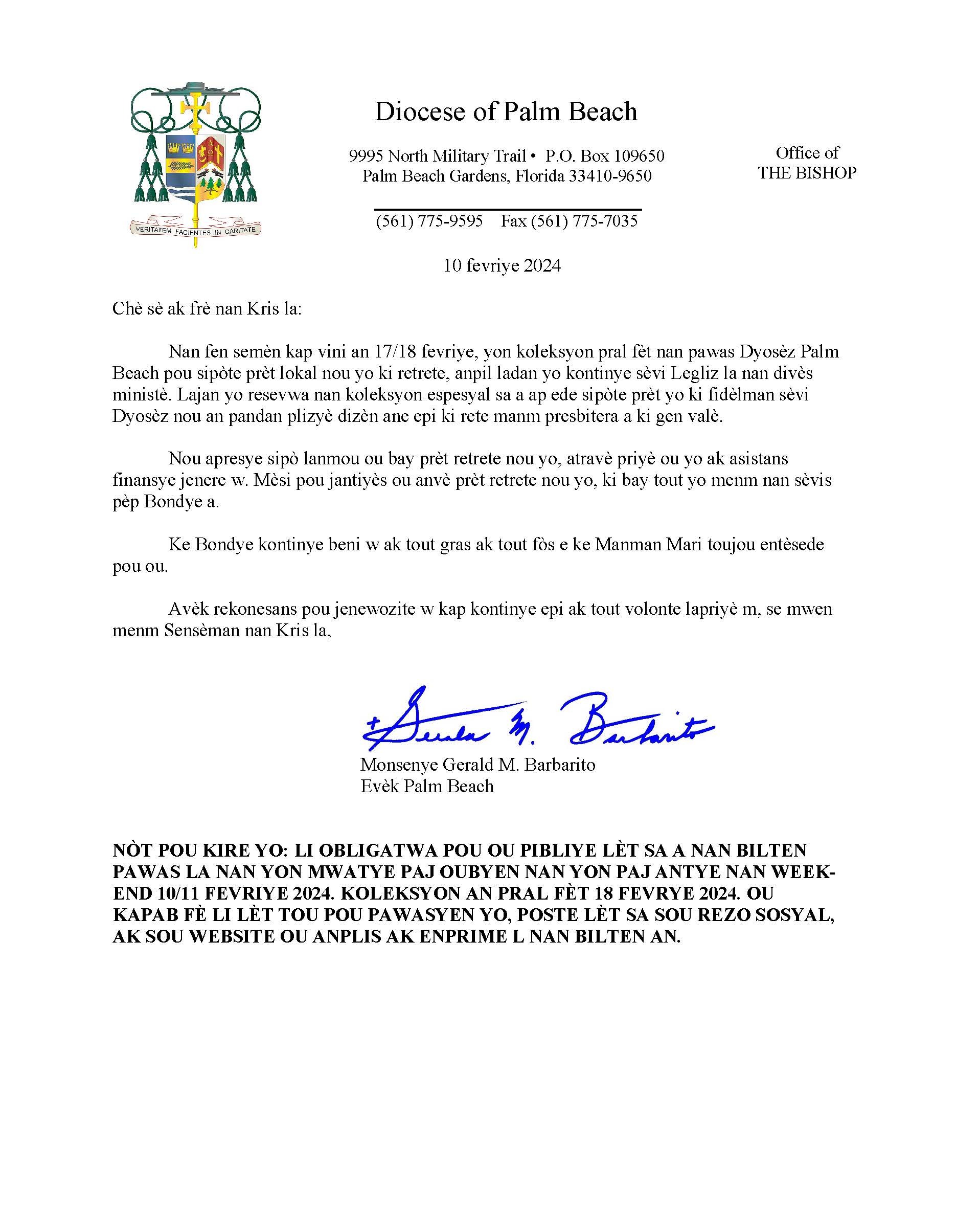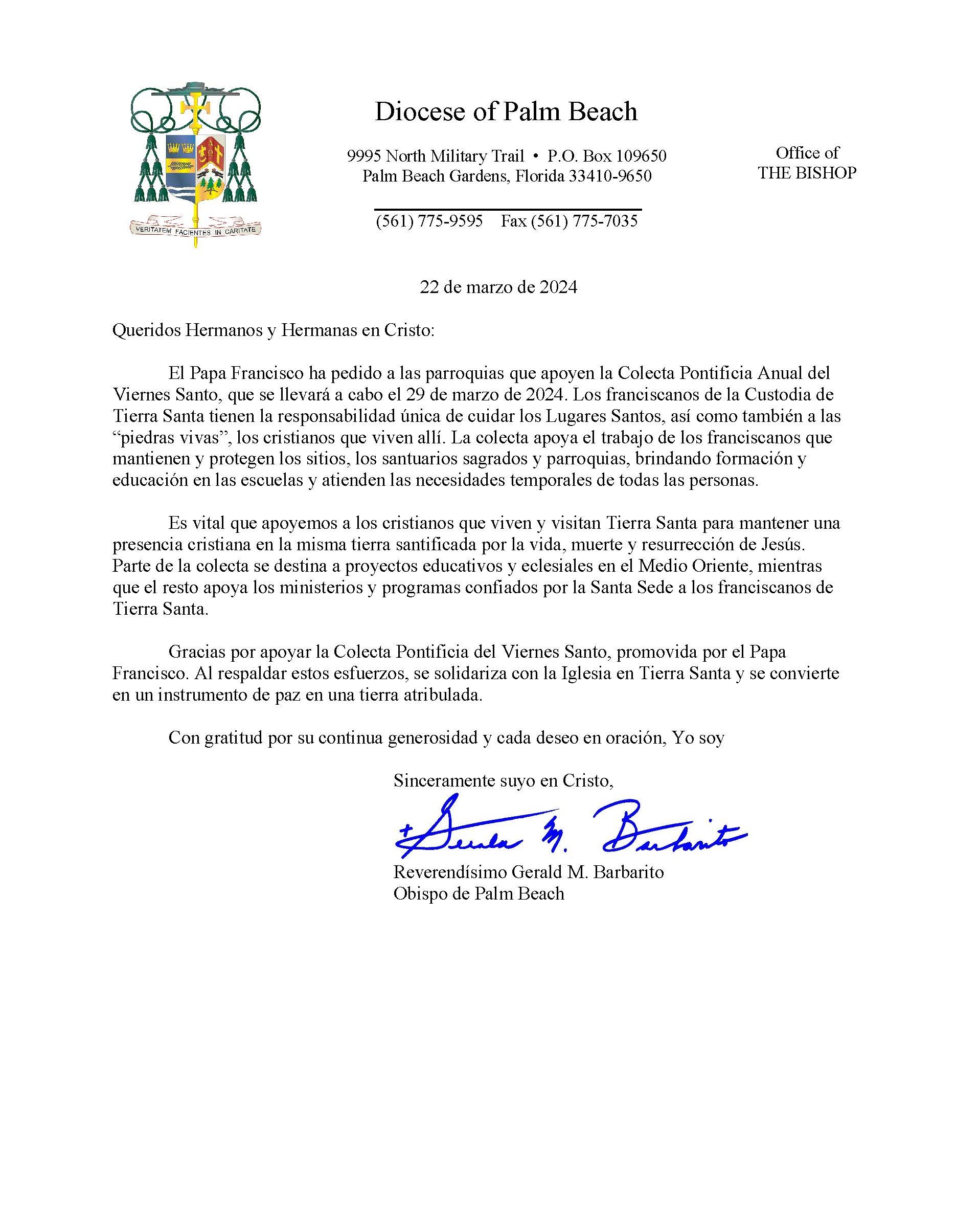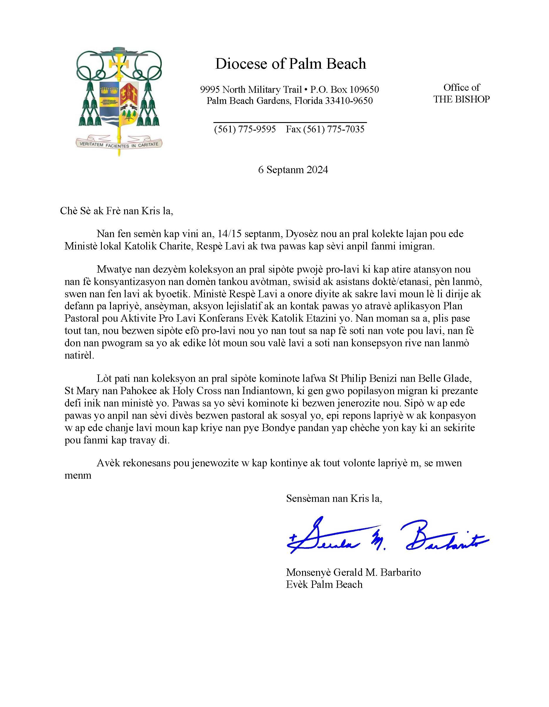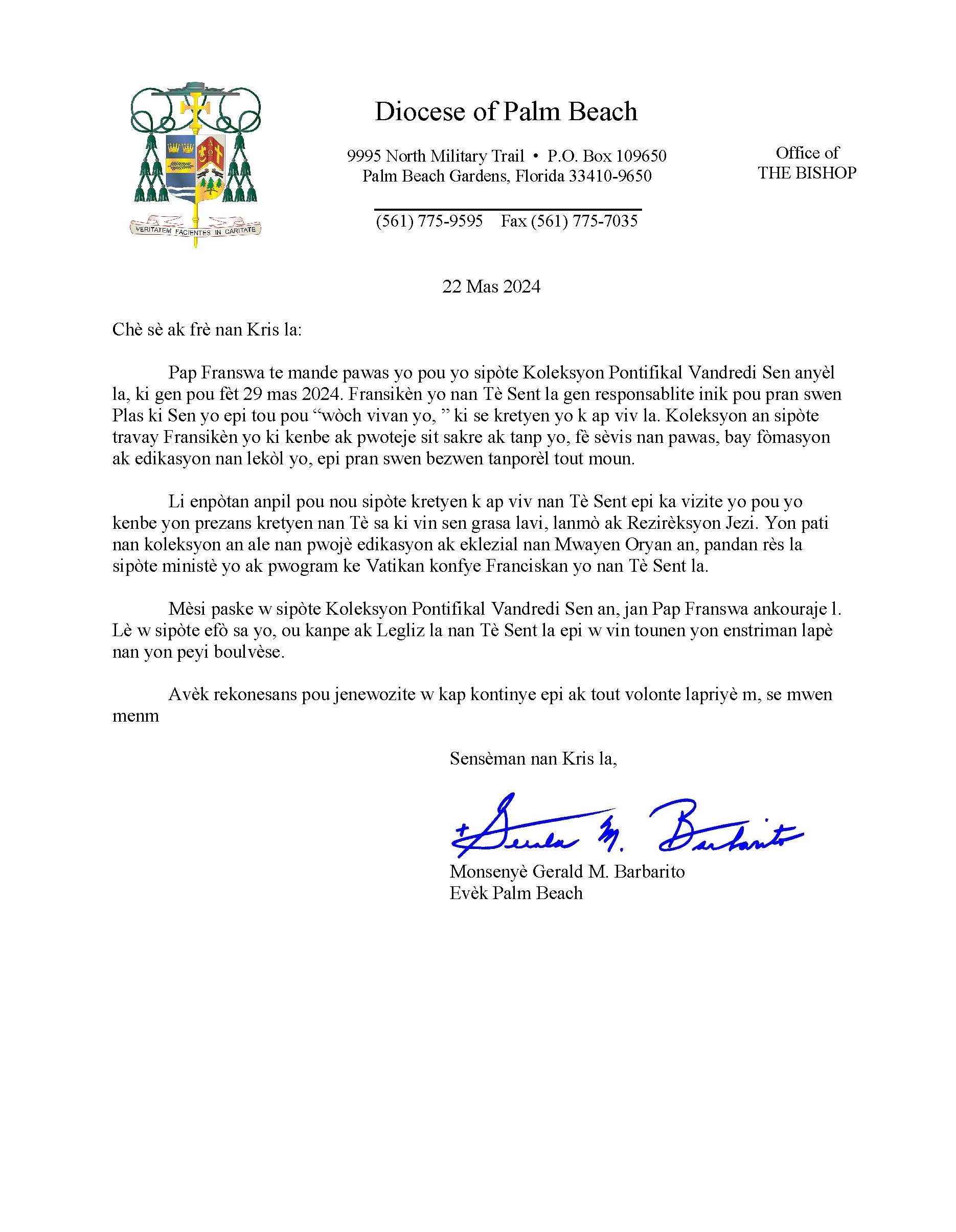 Below are the letters required to be published as a full page or half page in parish bulletins the weekend before the collection occurs. These letters are from the Bishop and the branding standards of the letter should be followed. The letter may also be read aloud, in addition to it being printed in the bulletin and shared on your parish’s social media and/or website. If you have questions about the letters, please contact the diocesan Director of Communications and Development (Jennifer Trefelner). If you have questions about reporting and submitting collection funds, please contact the diocesan Finance Office.