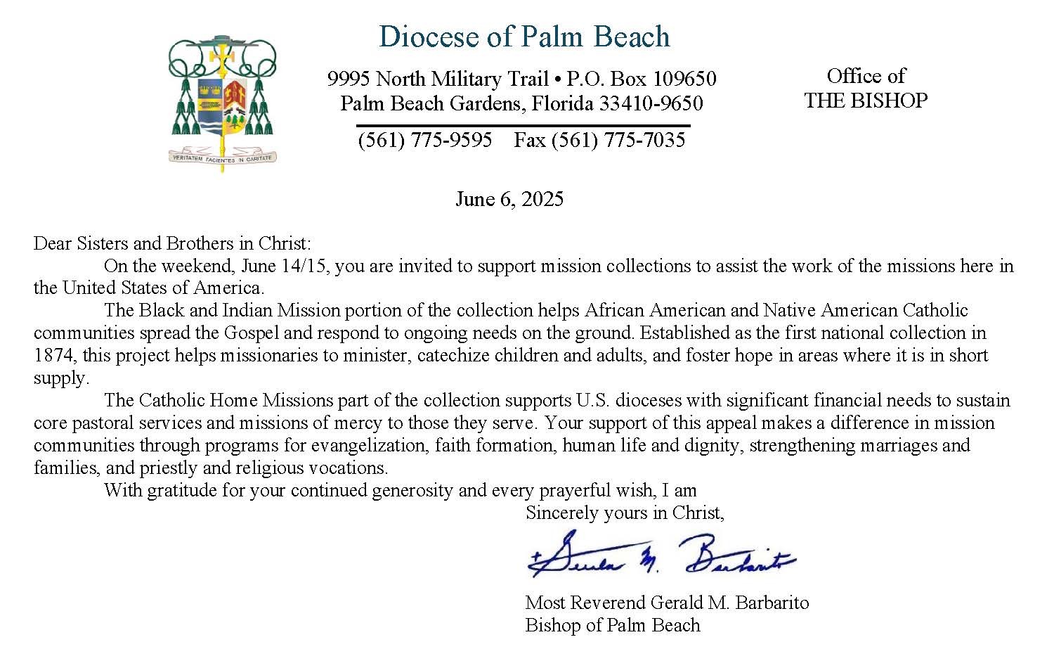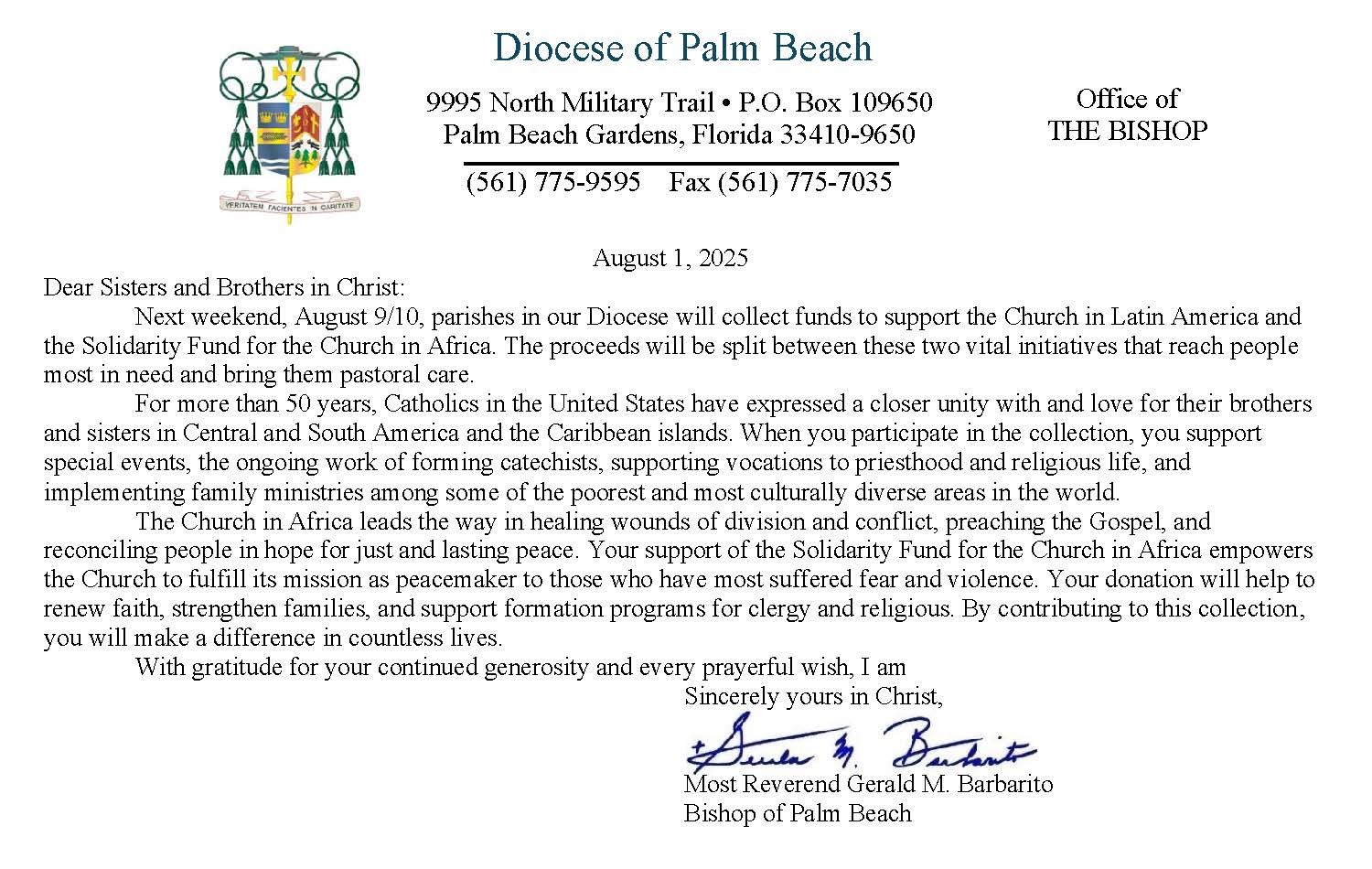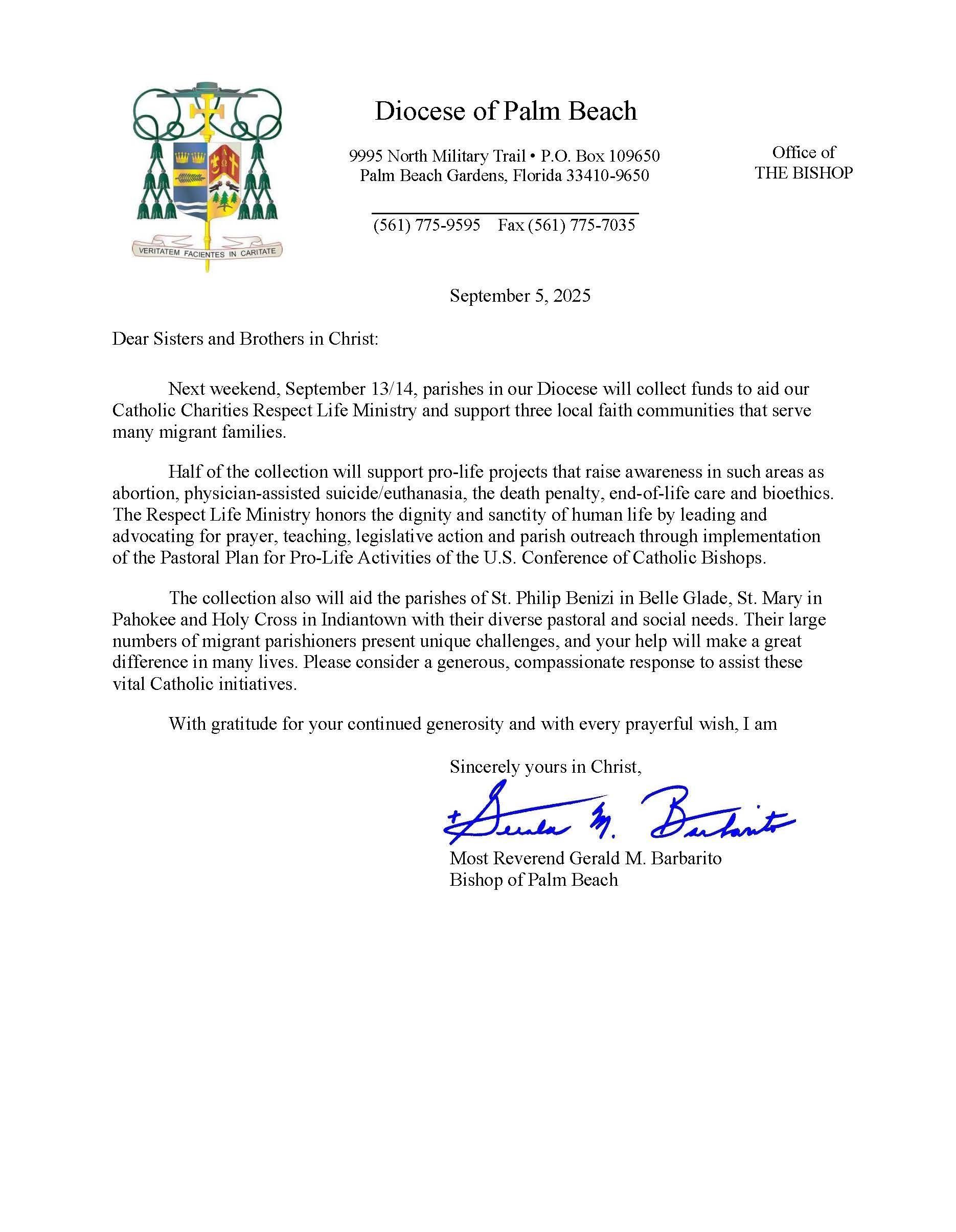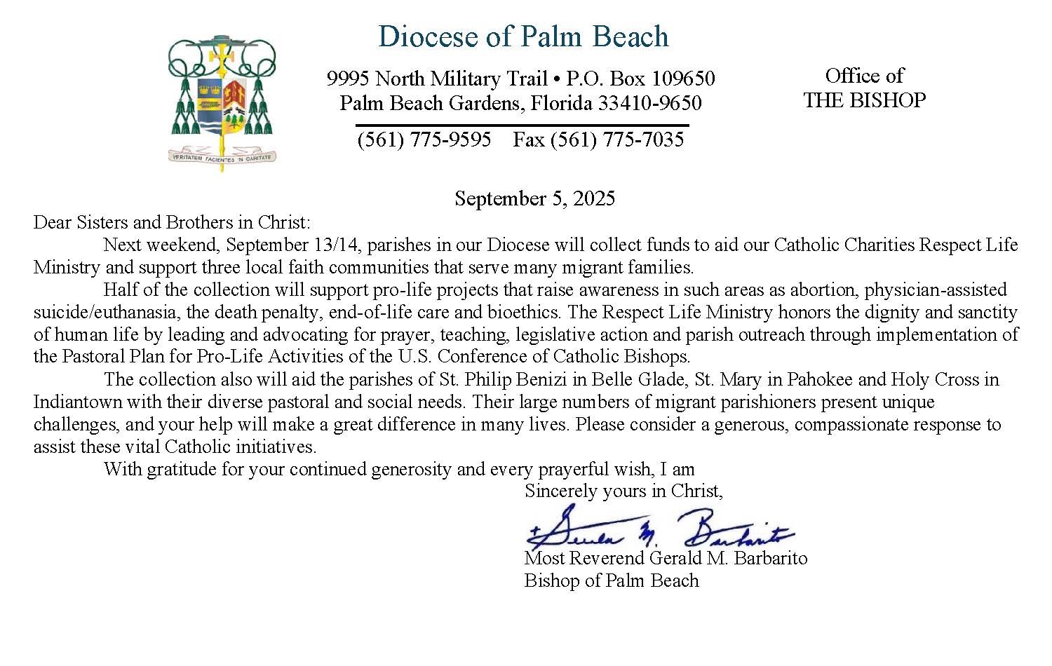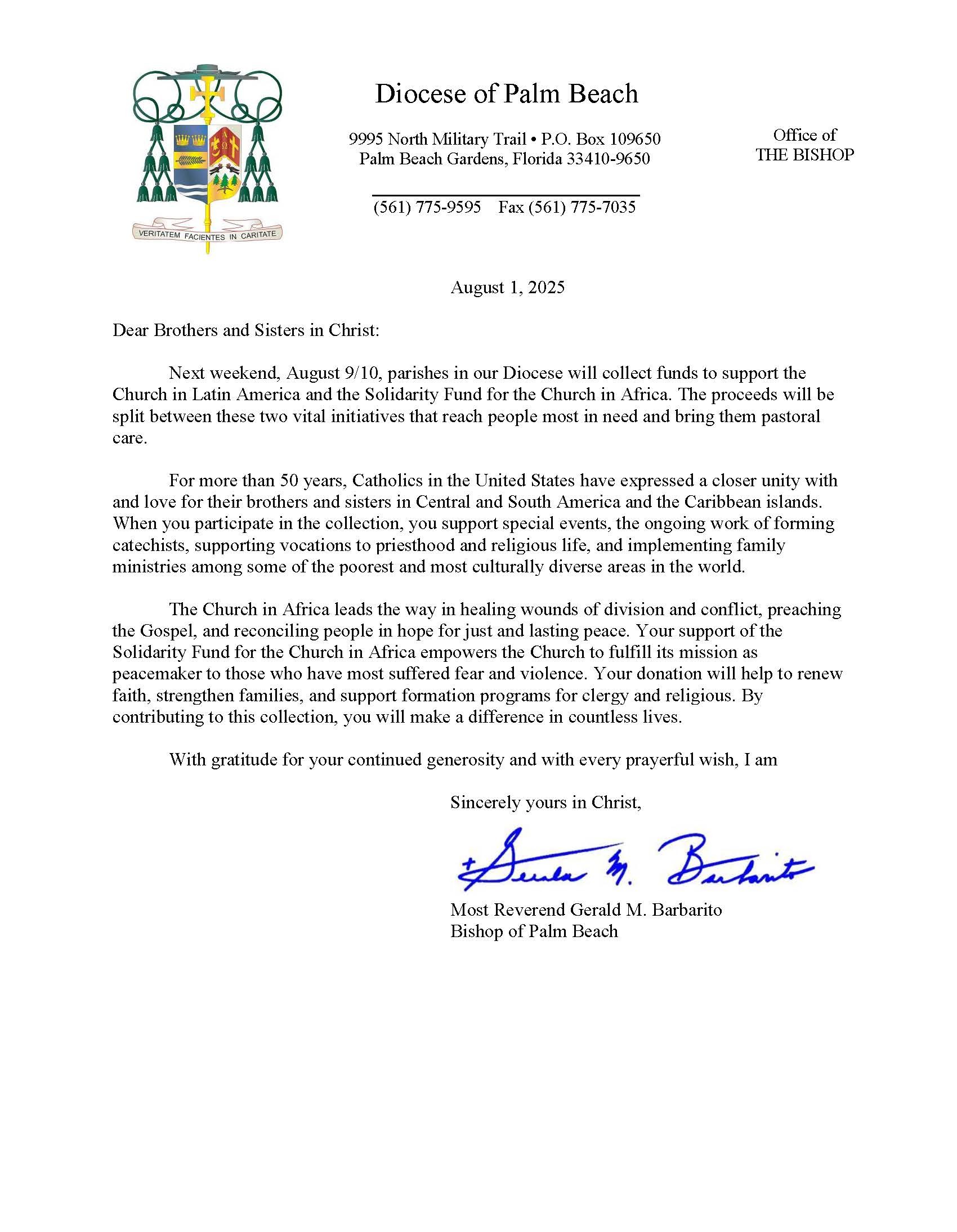 Below are the letters required to be published as a full page or half page in parish bulletins the weekend before the collection occurs. These letters are from the Bishop and the branding standards of the letter should be followed. The letter may also be read aloud, in addition to it being printed in the bulletin and shared on your parish’s social media and/or website. If you have questions about the letters, please contact the diocesan Director of Communications and Development (Jennifer Trefelner). If you have questions about reporting and submitting collection funds, please contact the diocesan Finance Office.