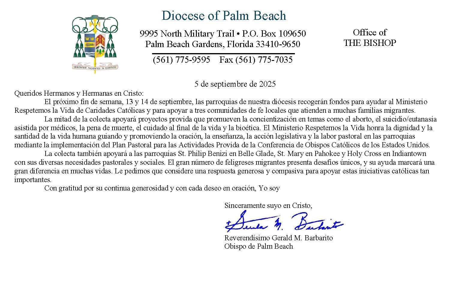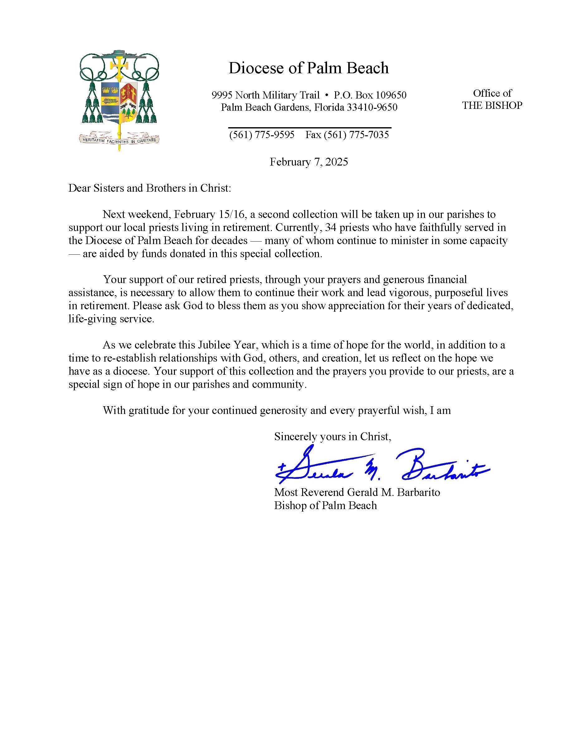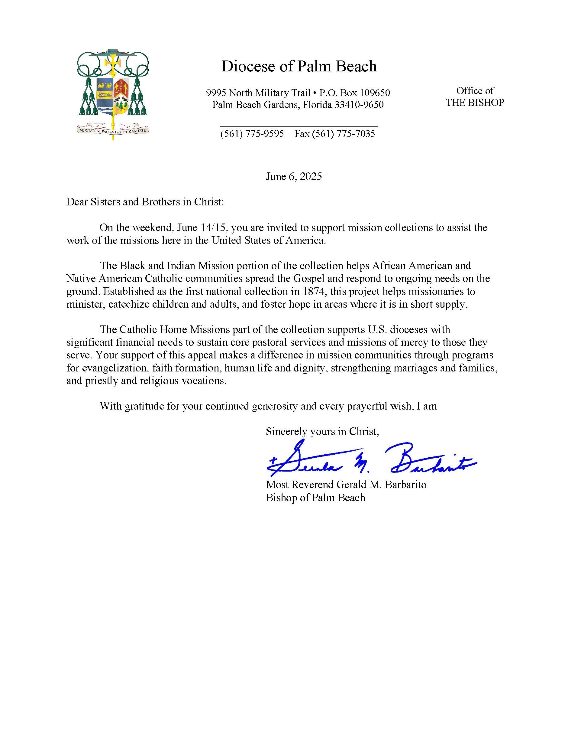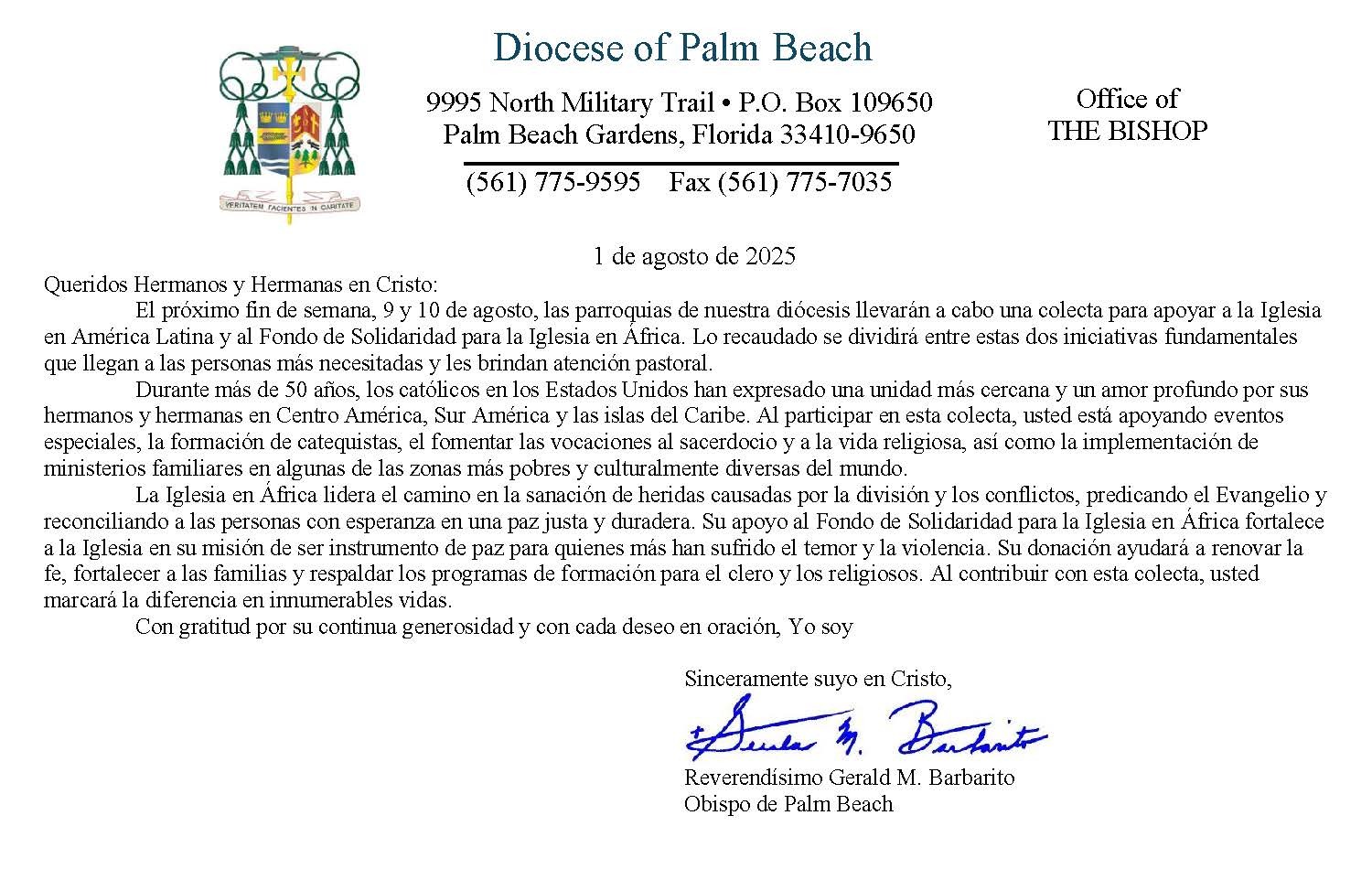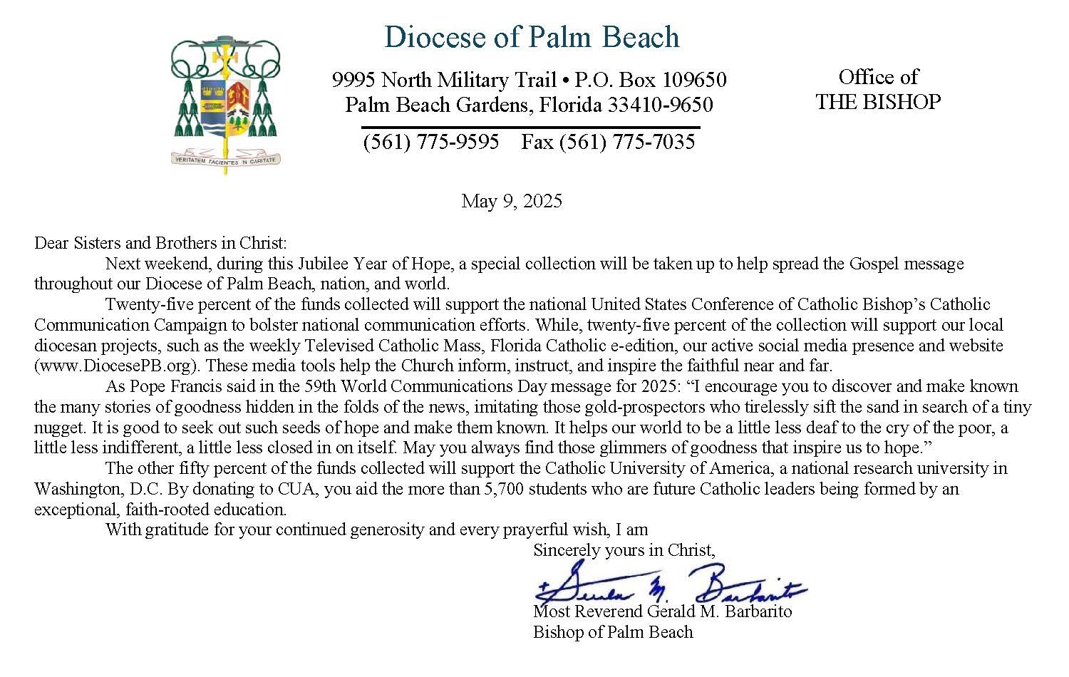 Below are the letters required to be published as a full page or half page in parish bulletins the weekend before the collection occurs. These letters are from the Bishop and the branding standards of the letter should be followed. The letter may also be read aloud, in addition to it being printed in the bulletin and shared on your parish’s social media and/or website. If you have questions about the letters, please contact the diocesan Director of Communications and Development (Jennifer Trefelner). If you have questions about reporting and submitting collection funds, please contact the diocesan Finance Office.