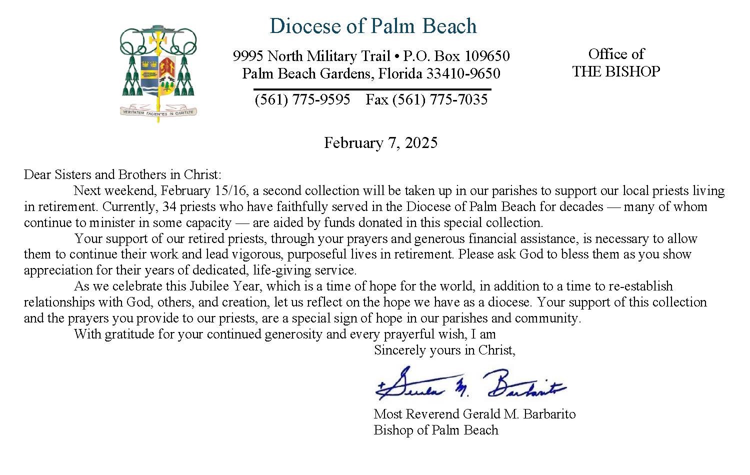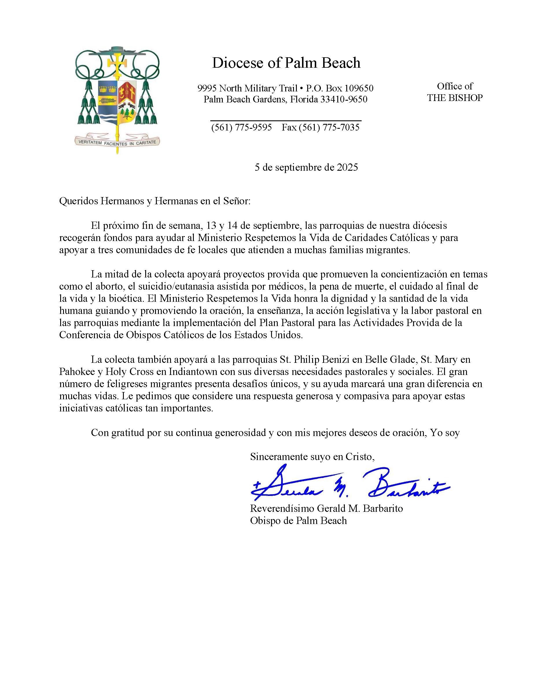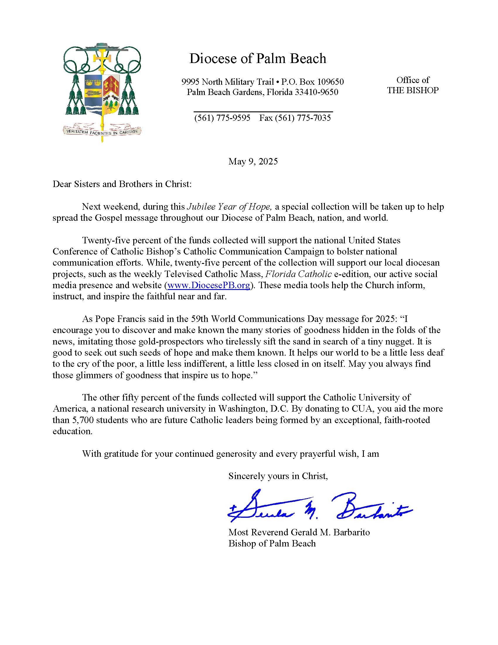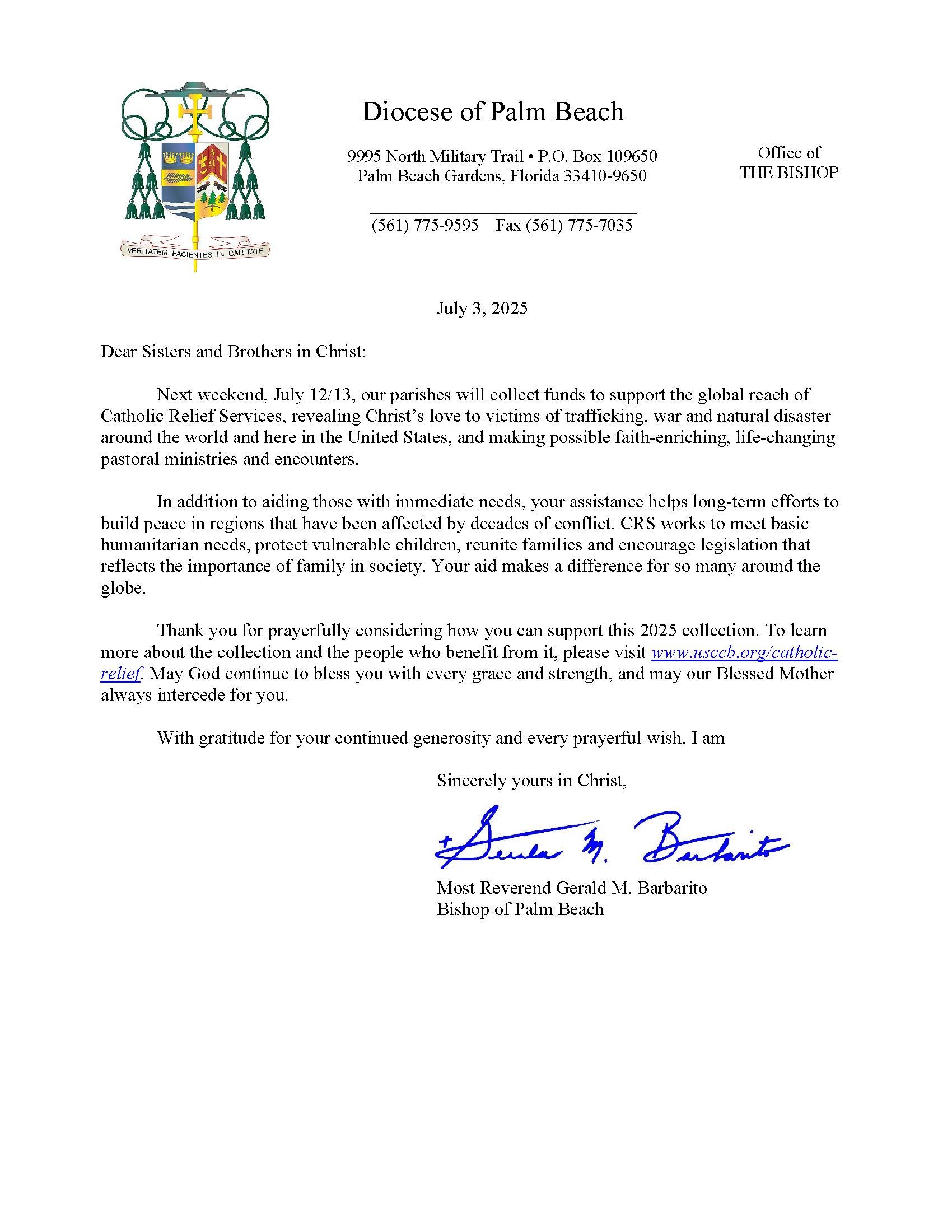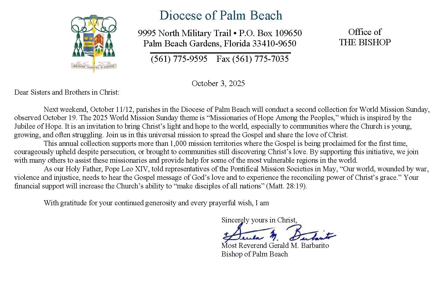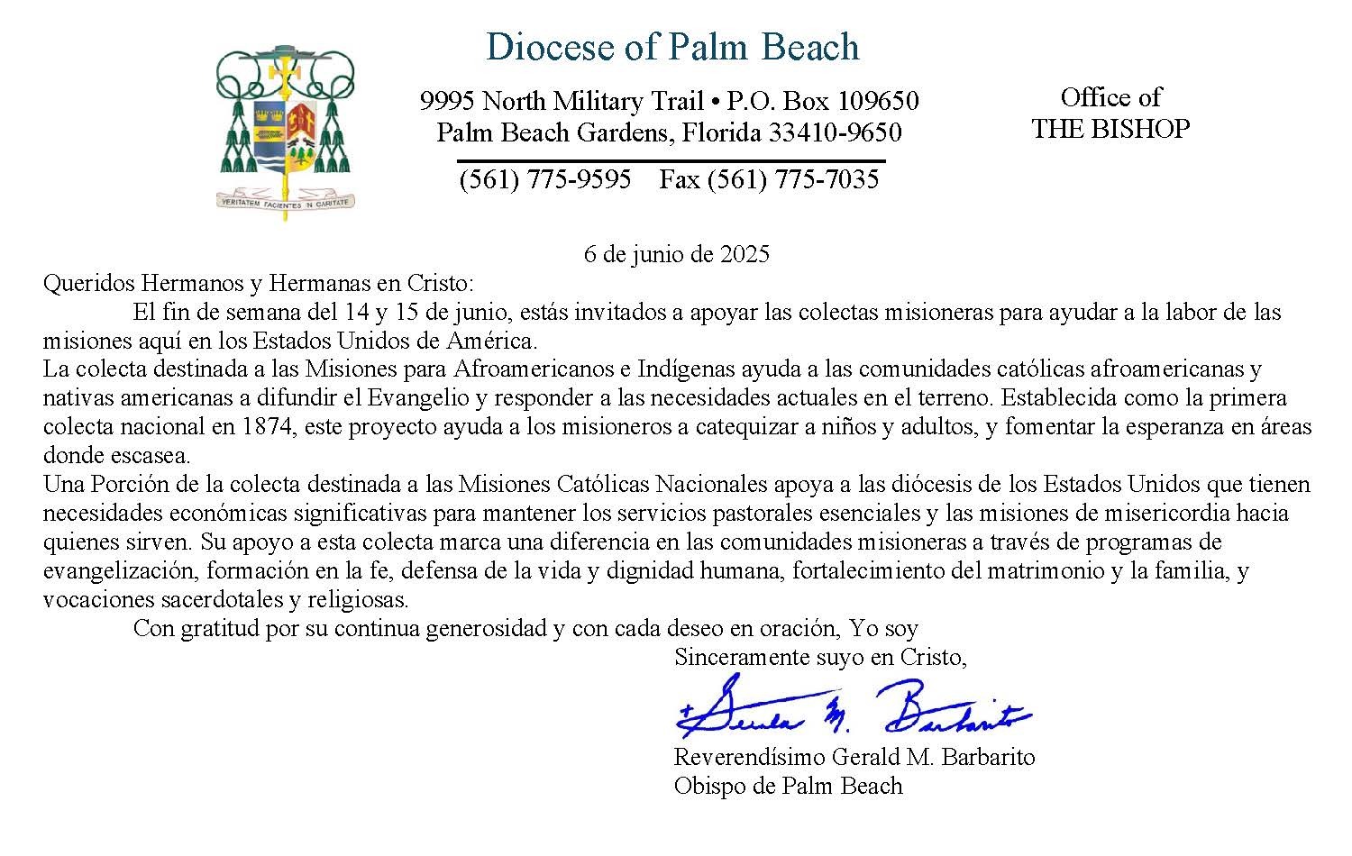 Below are the letters required to be published as a full page or half page in parish bulletins the weekend before the collection occurs. These letters are from the Bishop and the branding standards of the letter should be followed. The letter may also be read aloud, in addition to it being printed in the bulletin and shared on your parish’s social media and/or website. If you have questions about the letters, please contact the diocesan Director of Communications and Development (Jennifer Trefelner). If you have questions about reporting and submitting collection funds, please contact the diocesan Finance Office.