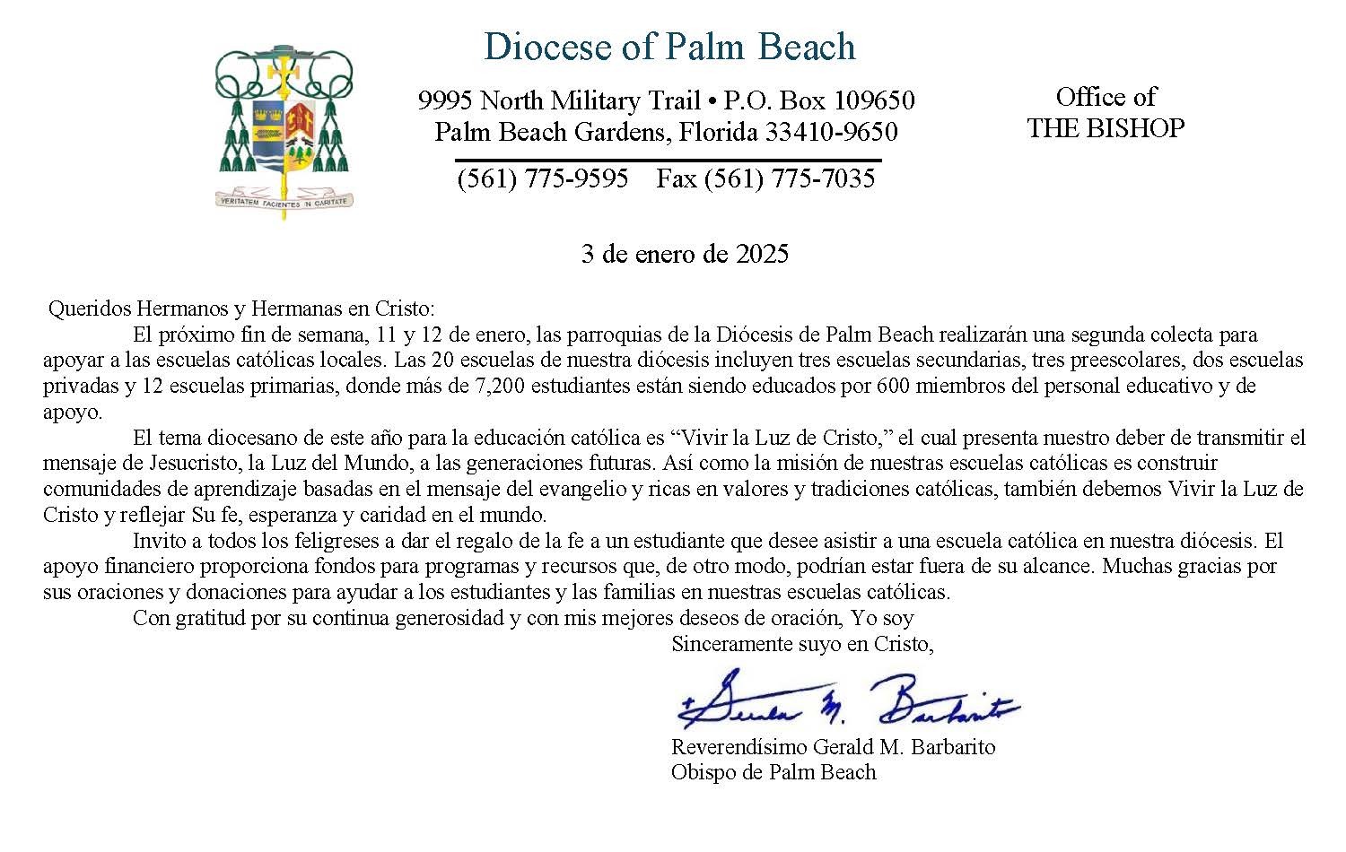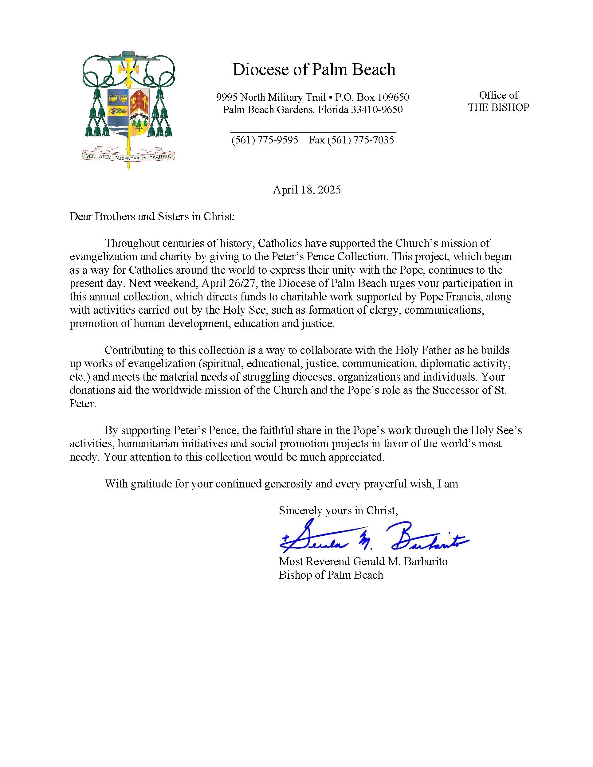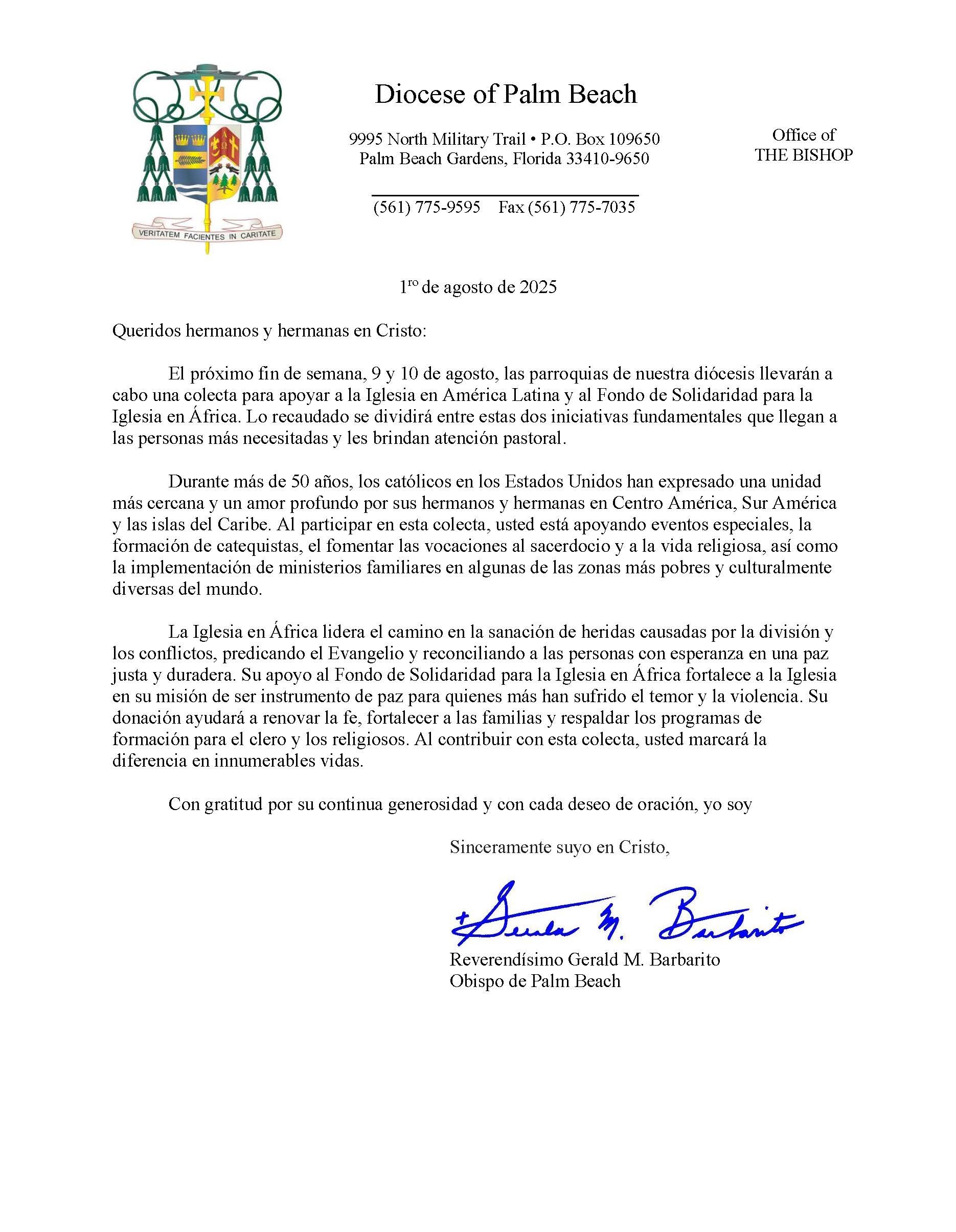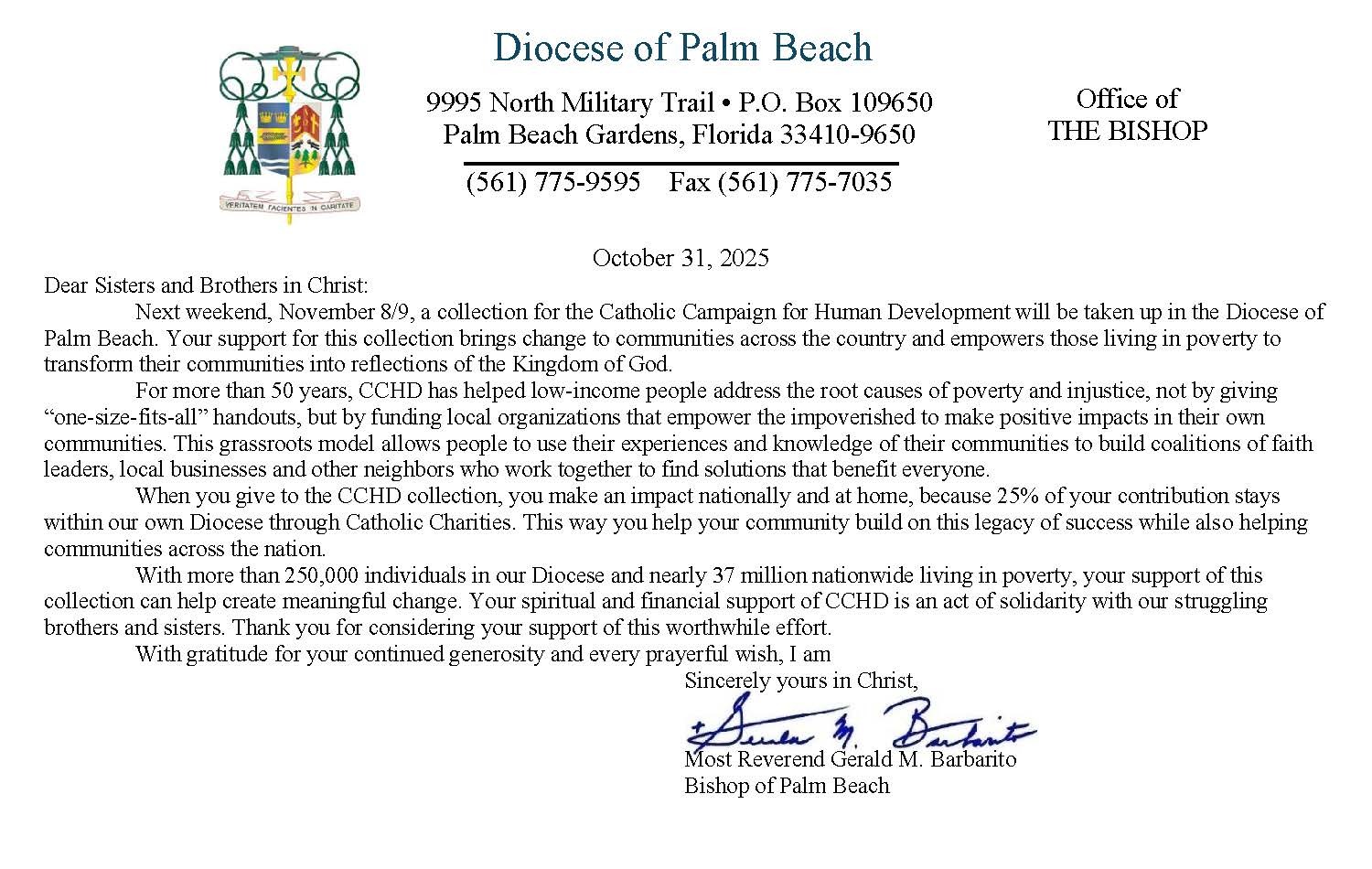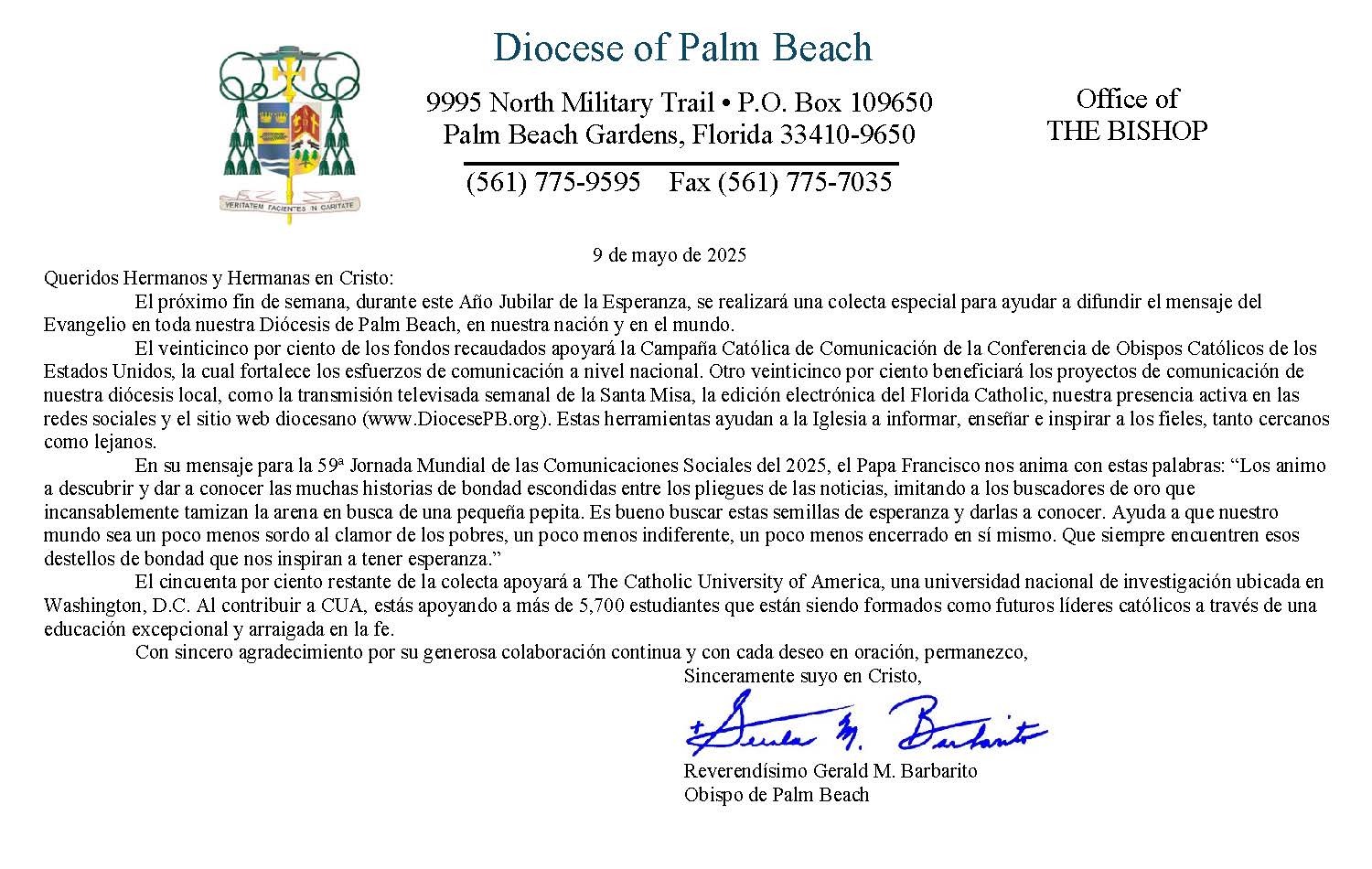 Below are the letters required to be published as a full page or half page in parish bulletins the weekend before the collection occurs. These letters are from the Bishop and the branding standards of the letter should be followed. The letter may also be read aloud, in addition to it being printed in the bulletin and shared on your parish’s social media and/or website. If you have questions about the letters, please contact the diocesan Director of Communications and Development (Jennifer Trefelner). If you have questions about reporting and submitting collection funds, please contact the diocesan Finance Office.