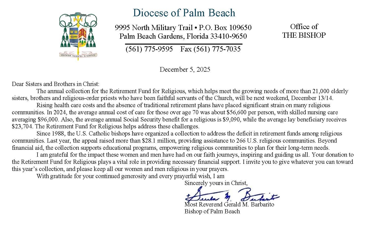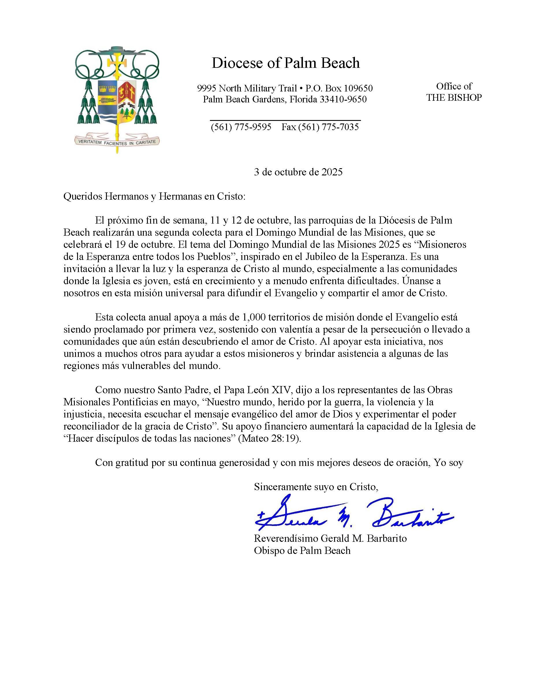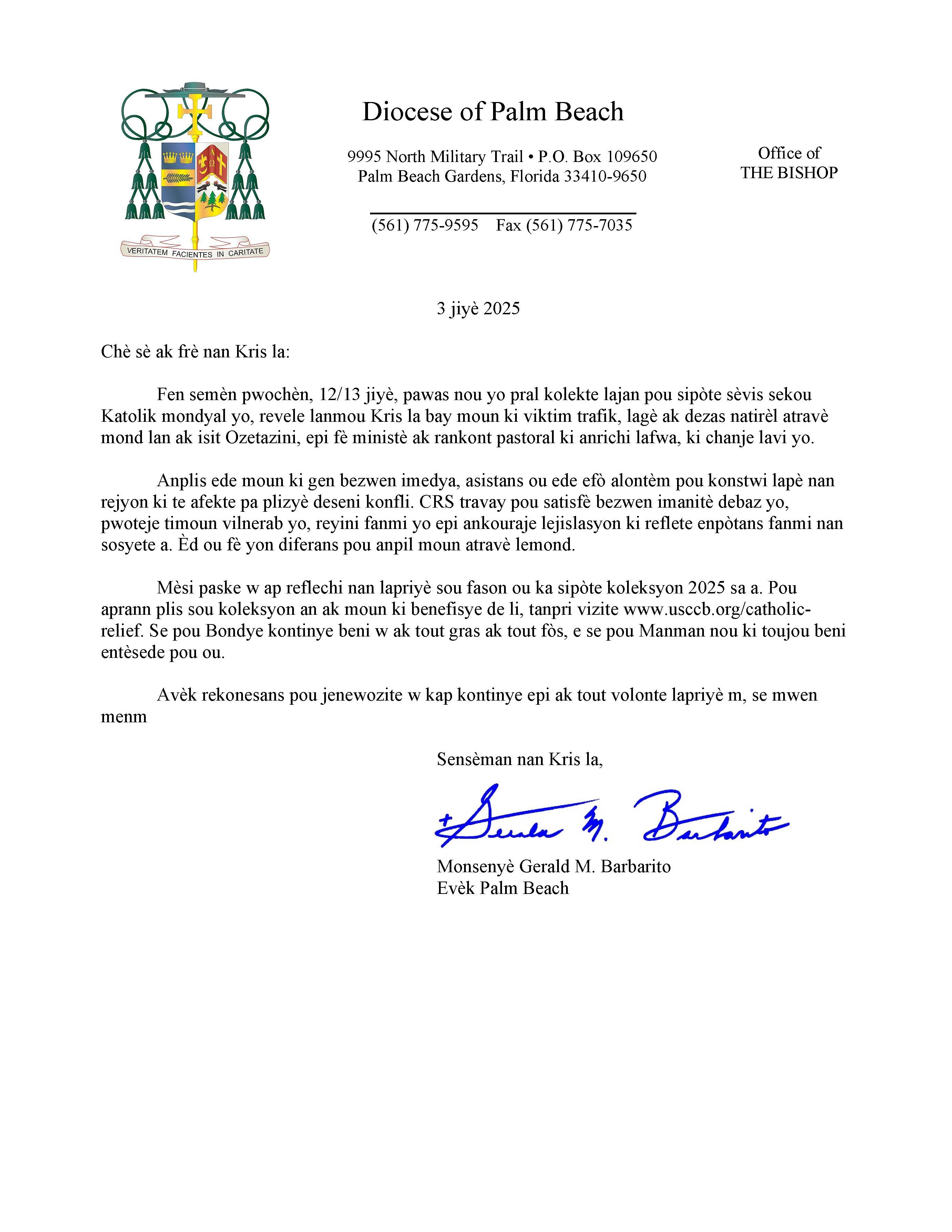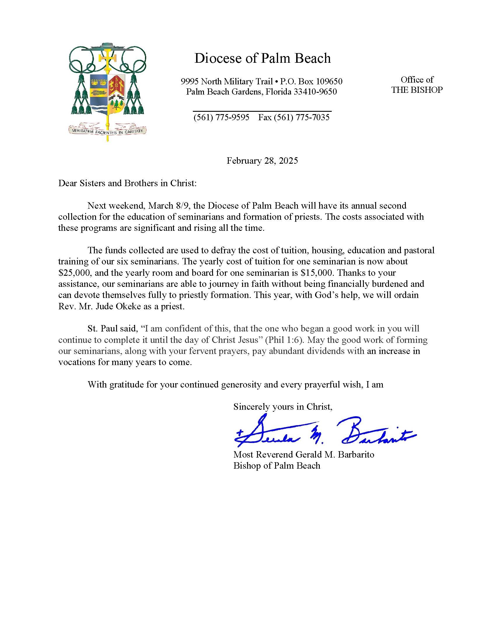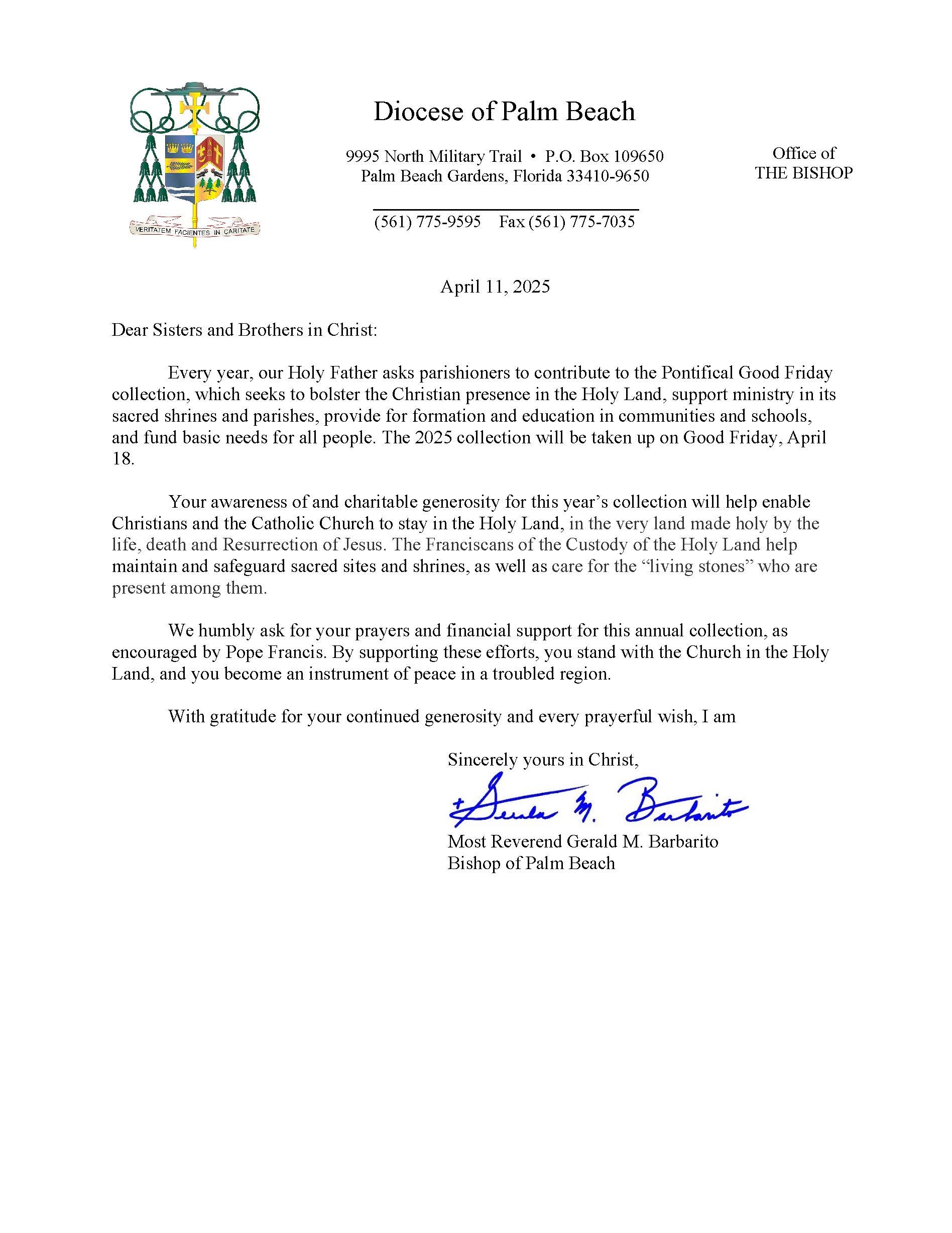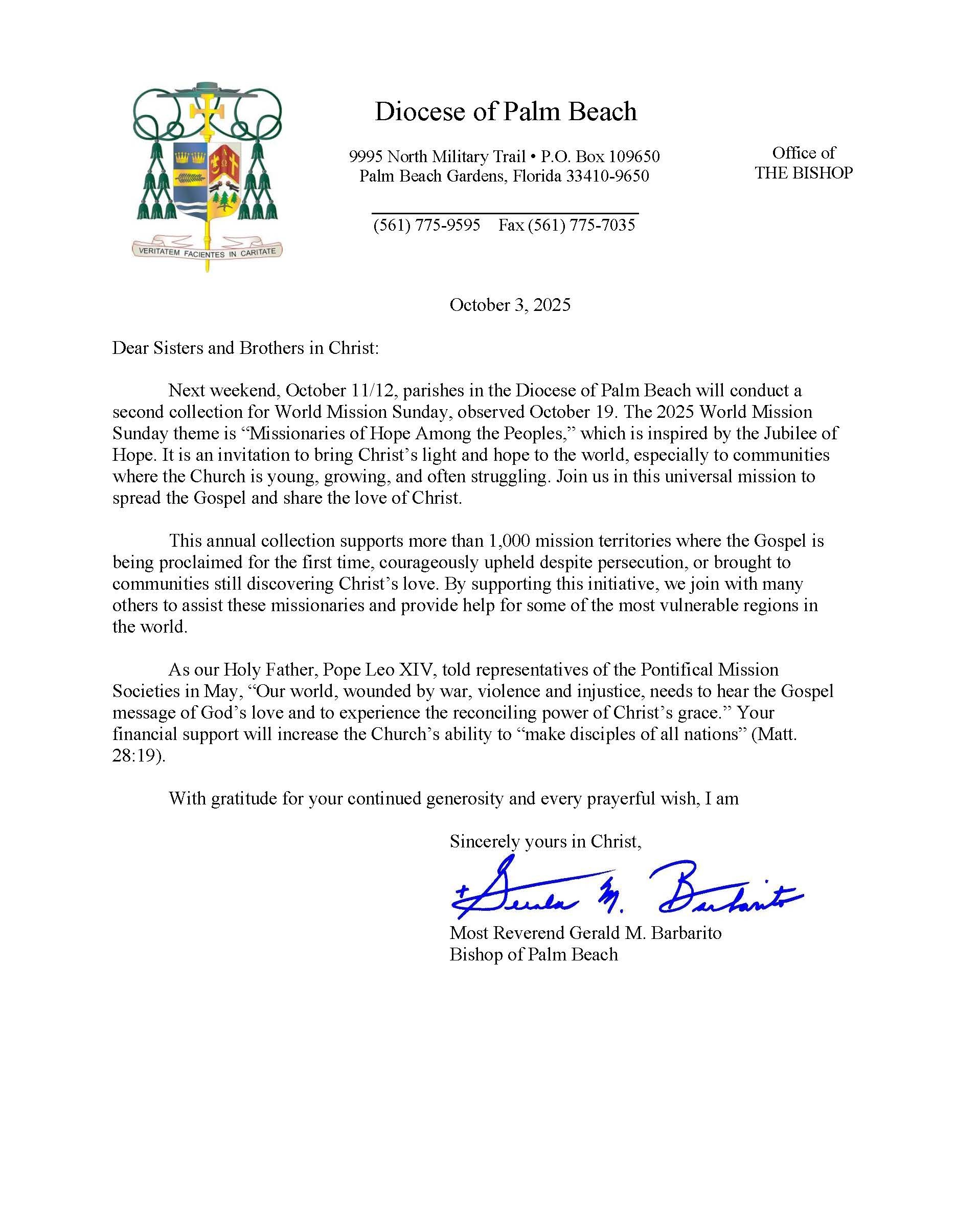 Below are the letters required to be published as a full page or half page in parish bulletins the weekend before the collection occurs. These letters are from the Bishop and the branding standards of the letter should be followed. The letter may also be read aloud, in addition to it being printed in the bulletin and shared on your parish’s social media and/or website. If you have questions about the letters, please contact the diocesan Director of Communications and Development (Jennifer Trefelner). If you have questions about reporting and submitting collection funds, please contact the diocesan Finance Office.