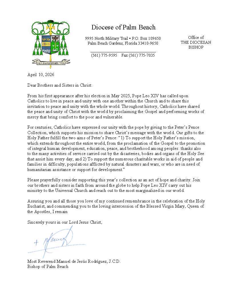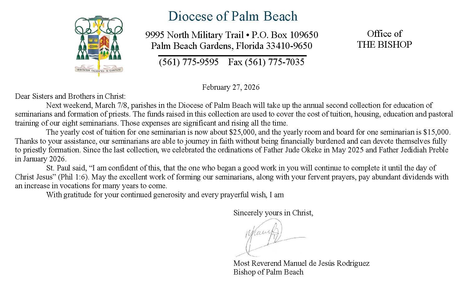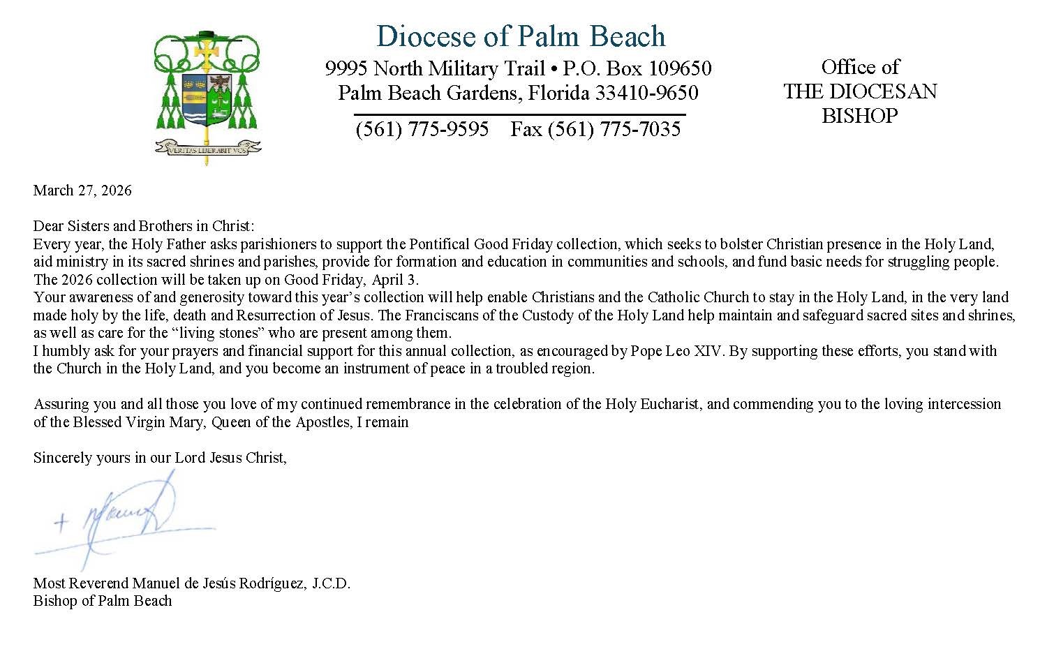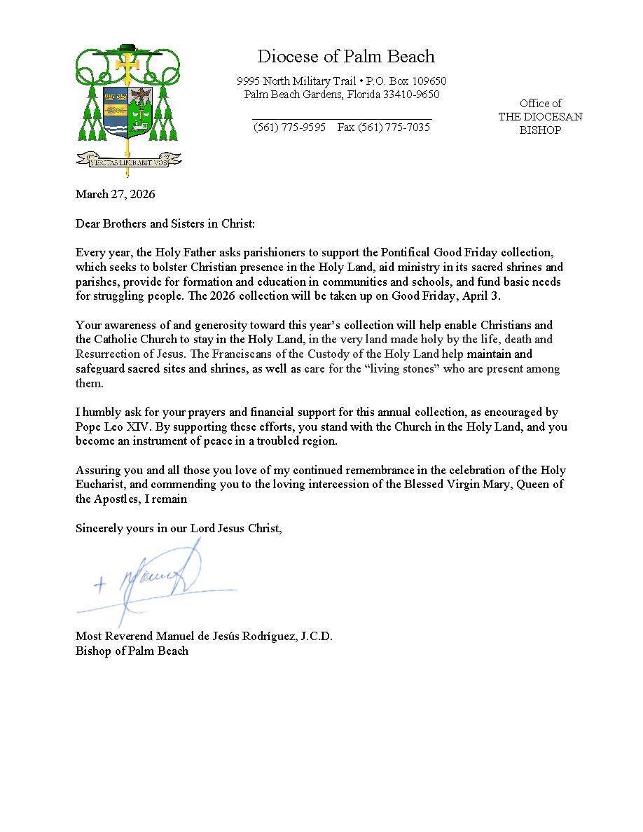 Below are the letters required to be published as a full page or half page in parish bulletins the weekend before the collection occurs. These letters are from the Bishop and the branding standards of the letter should be followed. The letter may also be read aloud, in addition to it being printed in the bulletin and shared on your parish’s social media and/or website. If you have questions about the letters, please contact the diocesan Director of Communications and Development (Jennifer Trefelner). If you have questions about reporting and submitting collection funds, please contact the diocesan Finance Office.