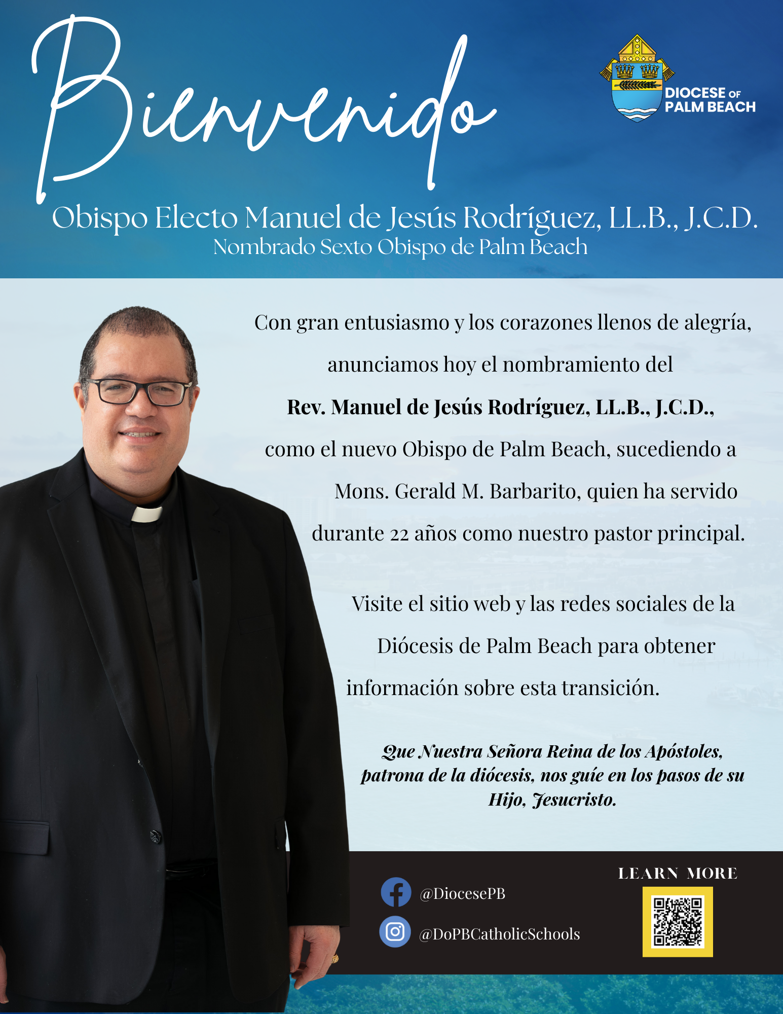 I am grateful to our Holy Father, Pope Leo XIV for his prayerful discernment in appointing a new Shepherd for the Diocese of Palm Beach in Bishop-elect Manuel de Jesus Rodriguez, a priest ordained for the Archdiocese of Santo Domingo in 2004, who has ministered as an incardinated priest of the Diocese of Brooklyn since 2012, his current assignment being the pastor of Our Lady of Sorrows, Corona, Queens. He is a young (50 years of age), enthusiastic and pastoral priest, who is described as a “priest who walks with the people.” With all of you, I welcome him to our Diocesan family, which will be greatly blessed by his ministry, and I very much look forward to getting to know him as in just a few days he has shown himself to be a deeply spiritual and exceptional priest. Read More/Download