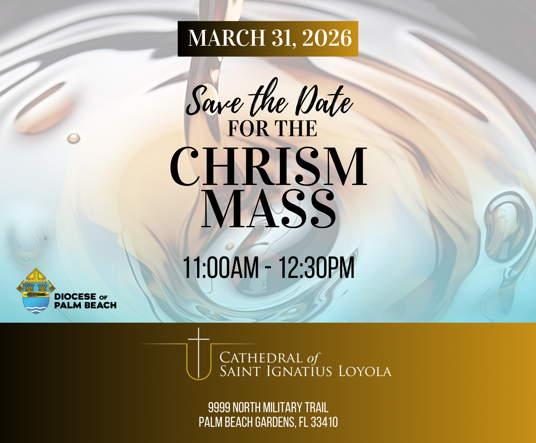 Most Reverend Manuel de Jesús Rodríguez, Bishop of Palm Beach is to celebrate the Chrism Mass at the Cathedral of St. Ignatius Loyola in Palm Beach Gardens on Tuesday March 31, 2026 at 11 a.m.