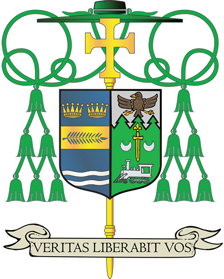The motto chosen by Bishop Rodríguez appears on a scroll below the shield. “Veritas Liberavit Vos,” which translates to “The truth will set you free,” is taken from Jn 8:32.